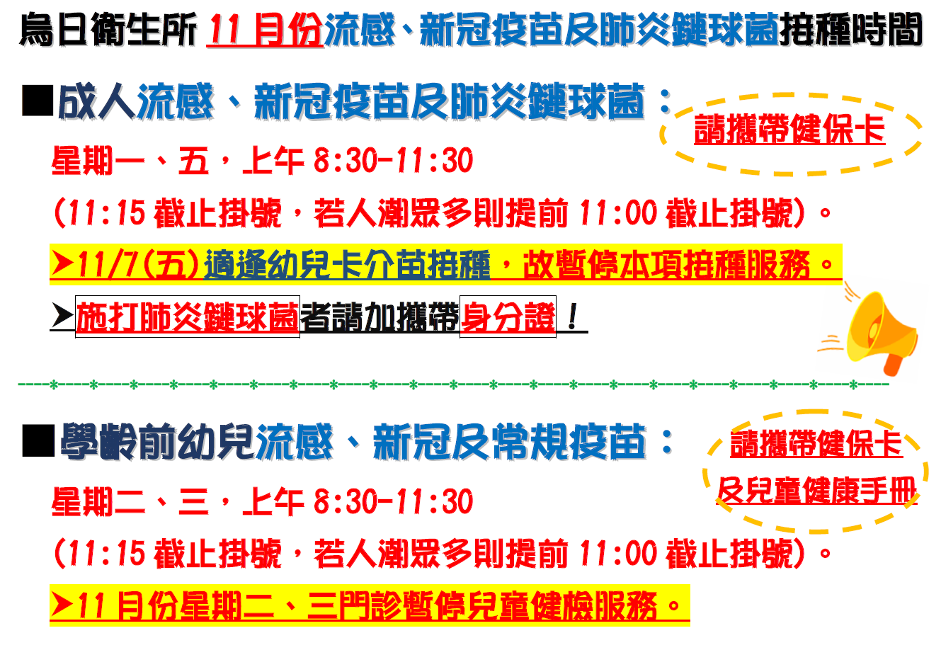 11月7日(五)適逢幼兒卡介苗接種,故暫停流感、新冠疫苗及肺炎鏈球菌接種服務。