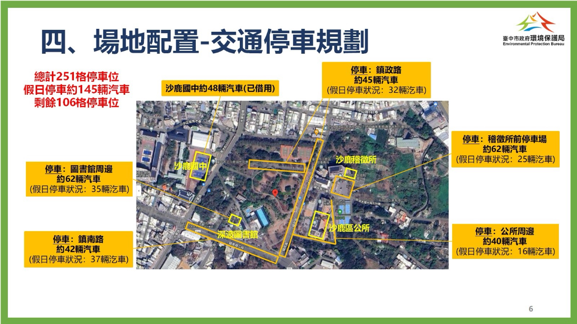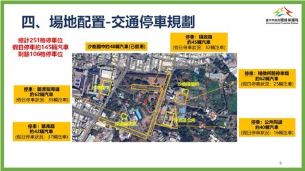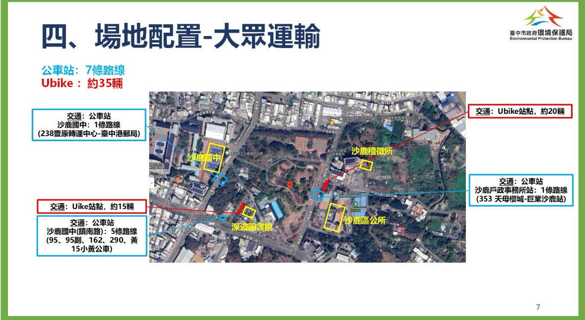 環保局表示,市民野餐日已邁入第四屆,市府致力推動「低碳城市、綠色運輸」政策,積極完善公共運輸網絡,在「沙鹿鎮立公園」鄰近的沙鹿戶政事務所及沙鹿國中周邊,設有3座公車站牌、7條公車路線,及2個YouBike站點,約可提供30至35輛自行車租借;公園周邊亦設有約250個停車位,為減輕交通壅塞與停車壓力,建議民眾可多加利用搭乘大眾交通工具前往。此外,為響應淨零排放目標,活動現場不提供一次性餐具及瓶裝水,並設有資源回收站及飲水補充區,呼籲參加民眾自備環保餐具與水壺,一同打造低碳特色的台中環保野餐日。