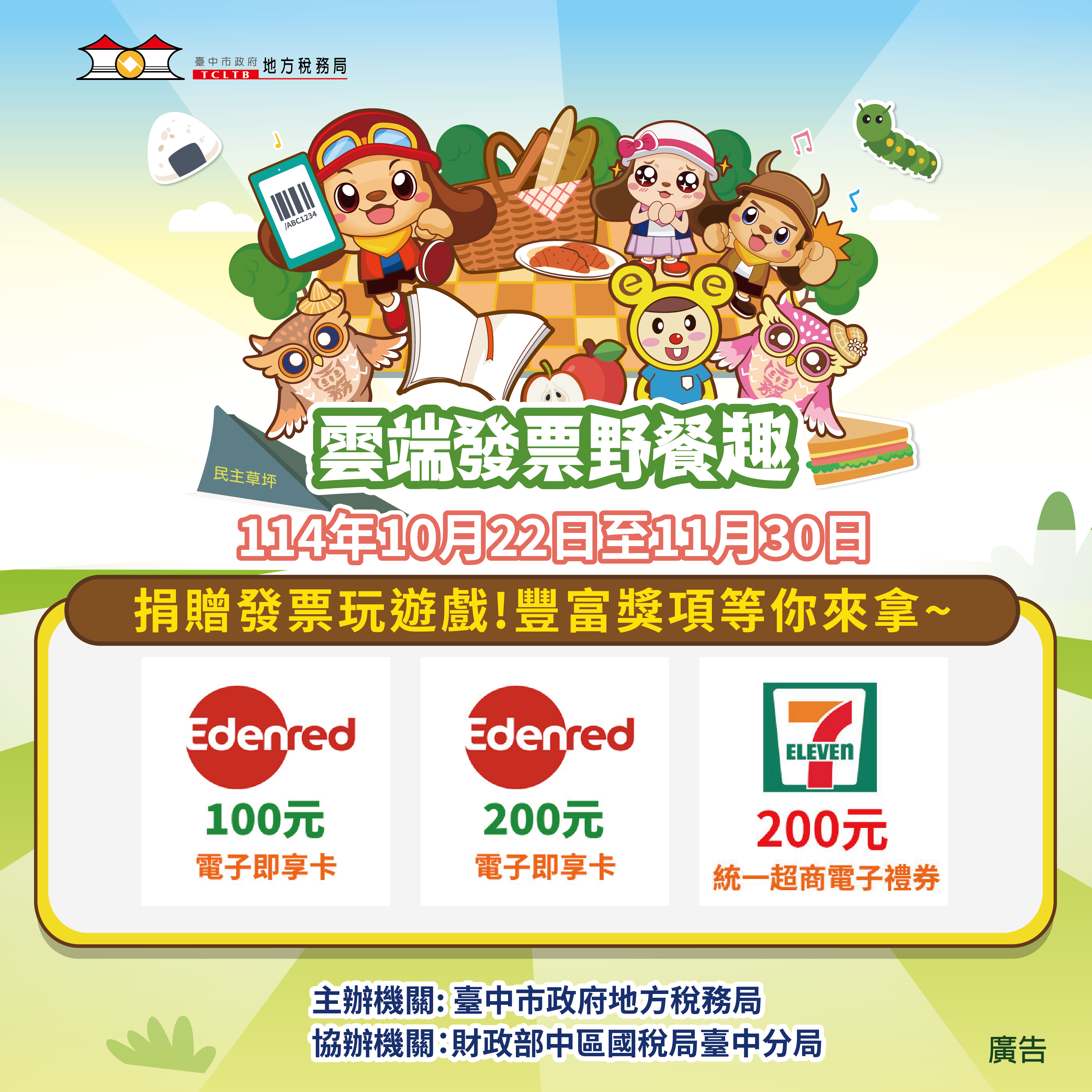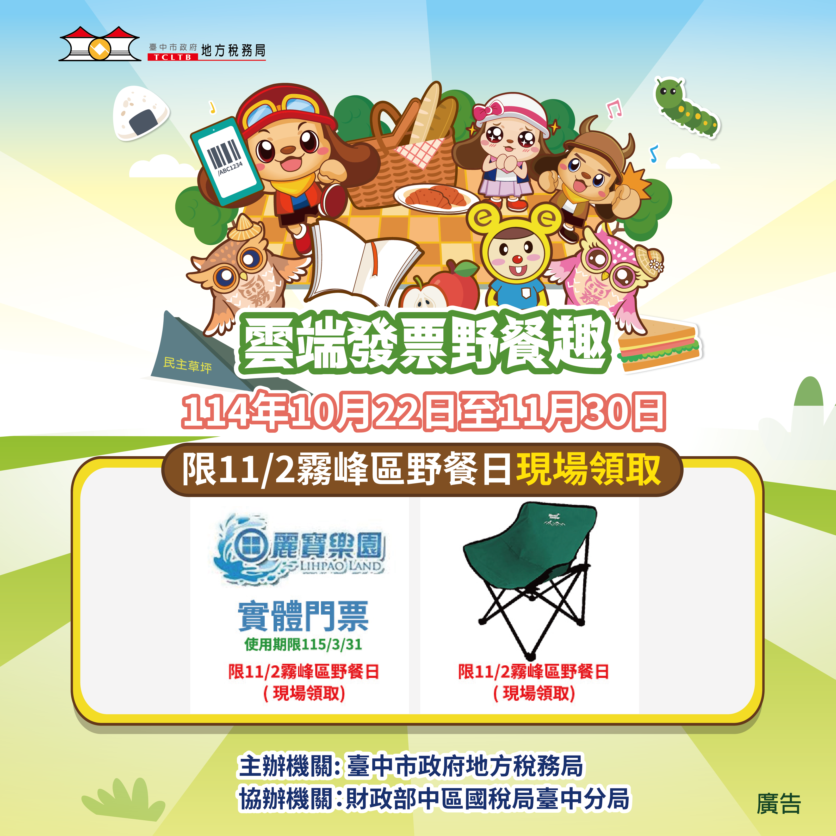 更多活動詳情,請至台中市政府地方稅務局官網或「中市稅輕鬆」粉絲專頁查詢,亦可撥打免付費服務電話 0800-000321 或 04-22585000 按 1 轉全智慧客服中心洽詢。誠摯邀您一同在秋日野餐季,輕鬆玩遊戲、做公益,為愛加分!(10/22*17)*地稅局