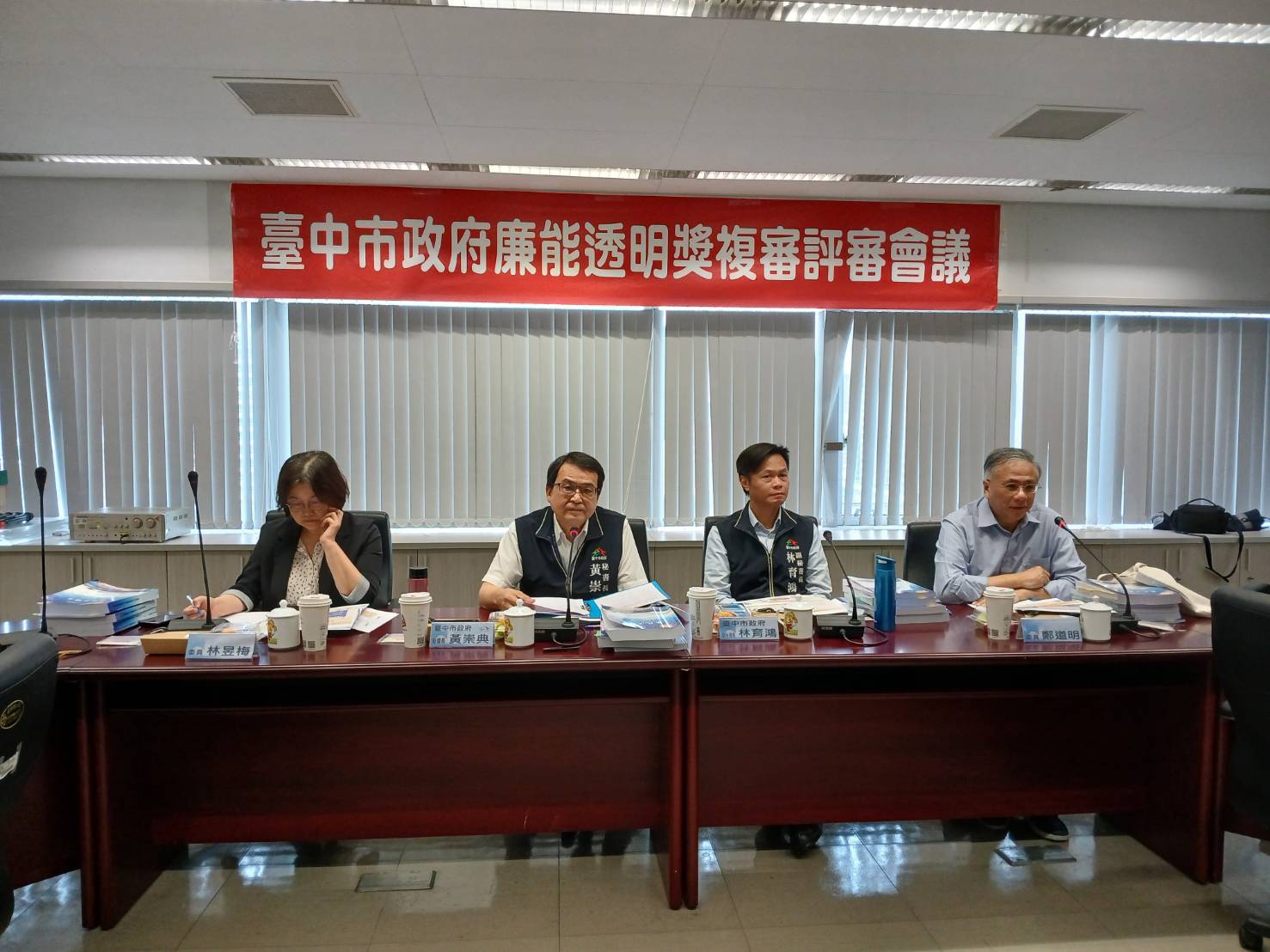台中市政府第十屆「廉能透明獎」評審總結會議於今(22)日下午召開,由市府秘書長黃崇典擔任主持人,邀請朝陽科技大學校長鄭道明、國立中興大學法政學院院長林昱梅、國立暨南國際大學公共行政與政治學系榮譽教授孫同文、東海大學政治學系教授陳建仁、逢甲大學土地管理學系前教授謝靜琪5位外聘專家學者及研究發展考核委員會、法制局及人事處代表共同執行評審總結會議