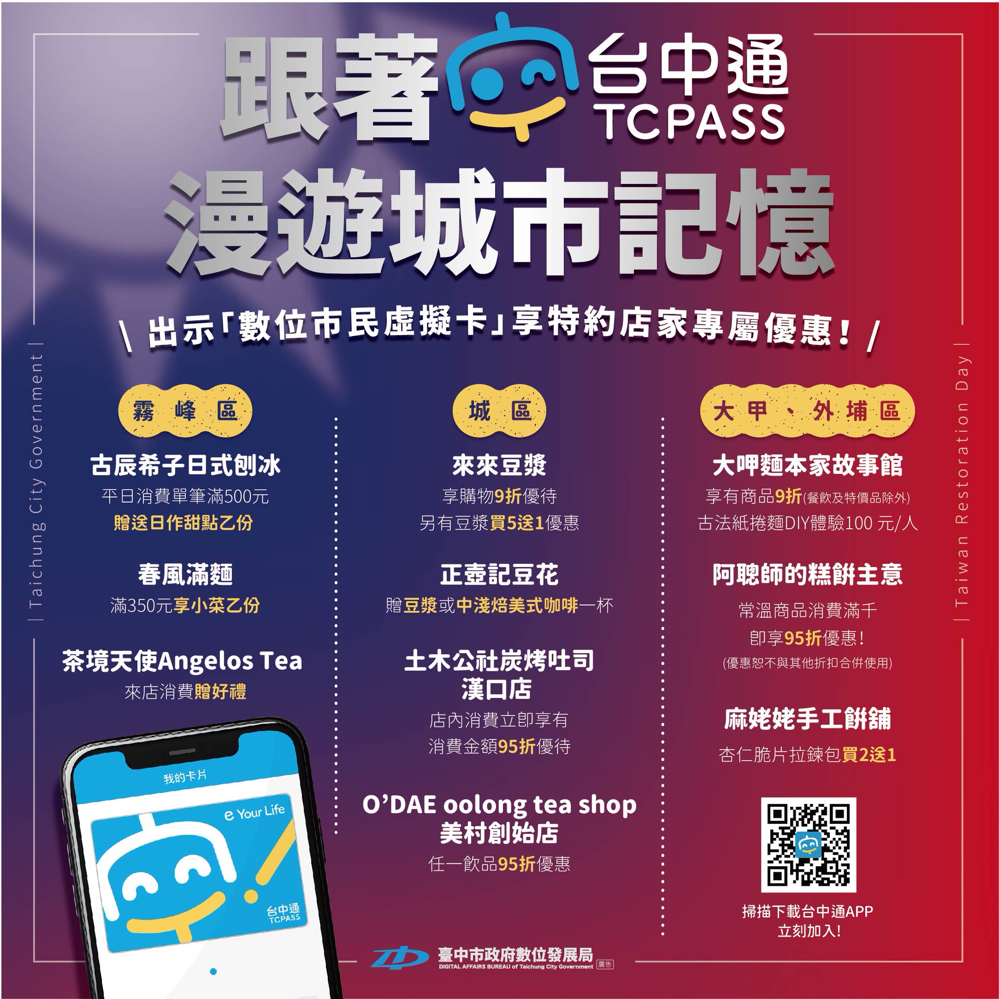 光輝十月連假不間斷!在中秋節、雙十節過後,台中市政府數位發展局邀請民眾把握連假遊台中,迎接「光復節連假」,打開《台中通 TCPASS》APP,一起走進老街巷弄,重溫城市記憶。精選大甲、外埔、霧峰及中、西區等富含歷史人文氣息的街區店家,只要出示數位市民虛擬卡,即可享受專屬折扣與好禮,在懷舊氛圍中體驗古早味與文青風的完美交融。