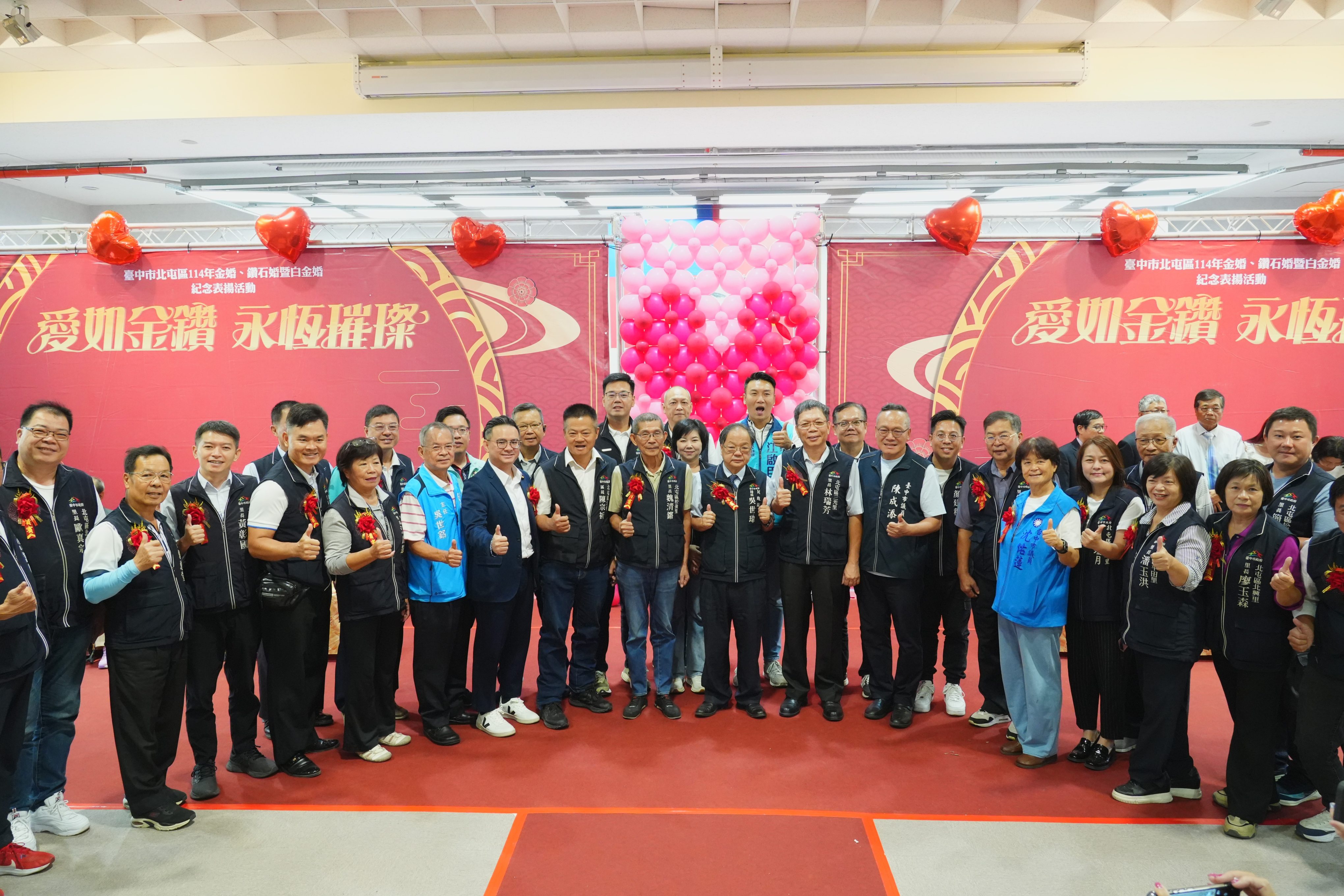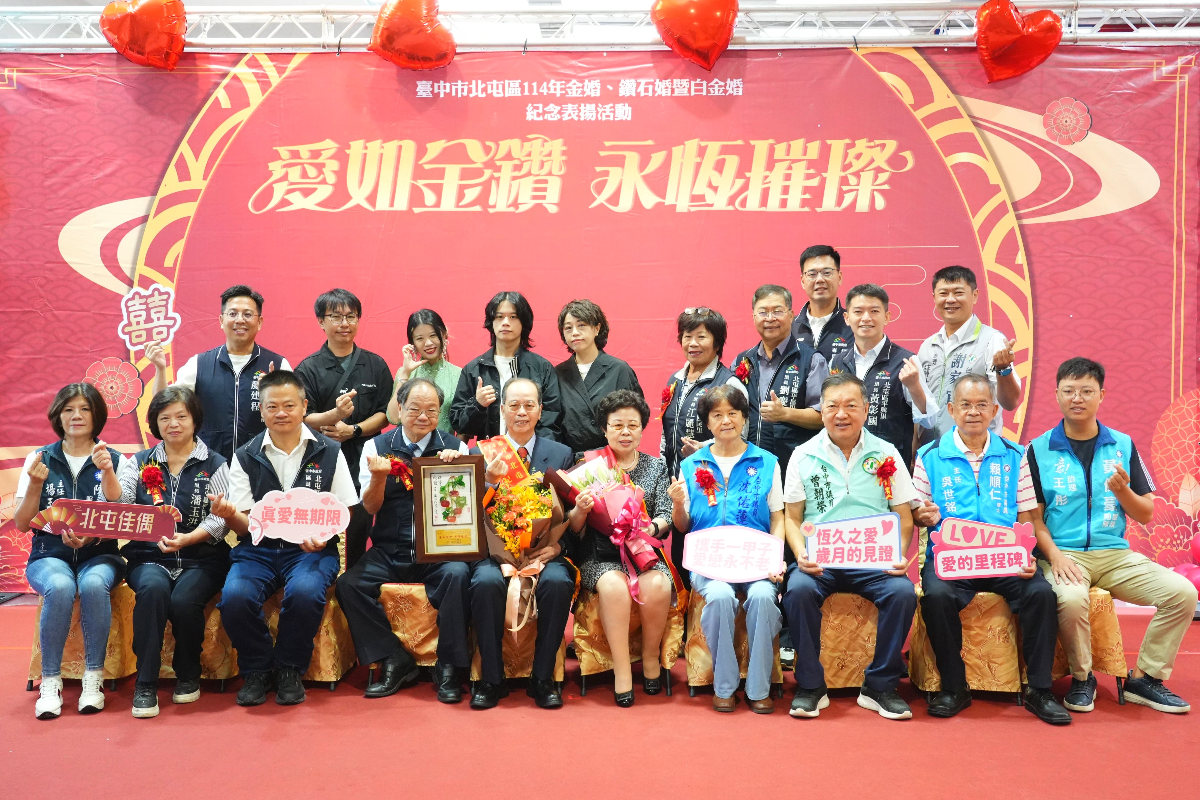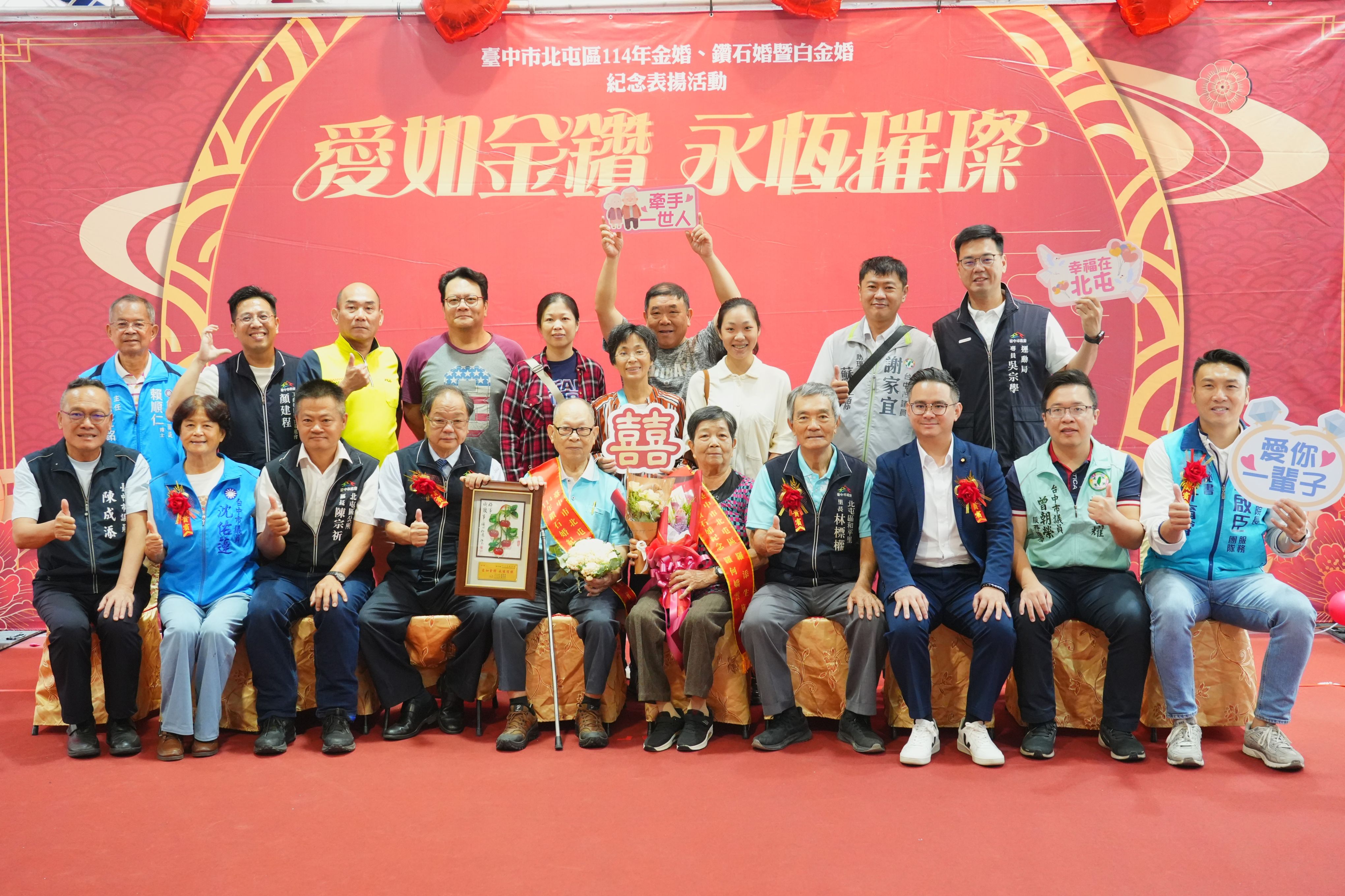 今日表揚活動,北屯區公所特別搭設夢幻氣球拱門與唯美拍照區,營造幸福浪漫氛圍,讓每對金婚、鑽石婚及白金婚的幸福佳偶與家人一同拍照合影留念,另公所也致贈精緻紀念禮品,祝福受表揚伉儷愛如金鑽、永恒璀燦。包括立法委員黃健豪、市議員陳成添、沈佑蓮、曾朝榮、謝家宜、民政局長吳世瑋、北屯區長陳宗祈及在地各里長均到場祝賀;立法院副院長江啟臣、市議員賴順仁也派員致意。