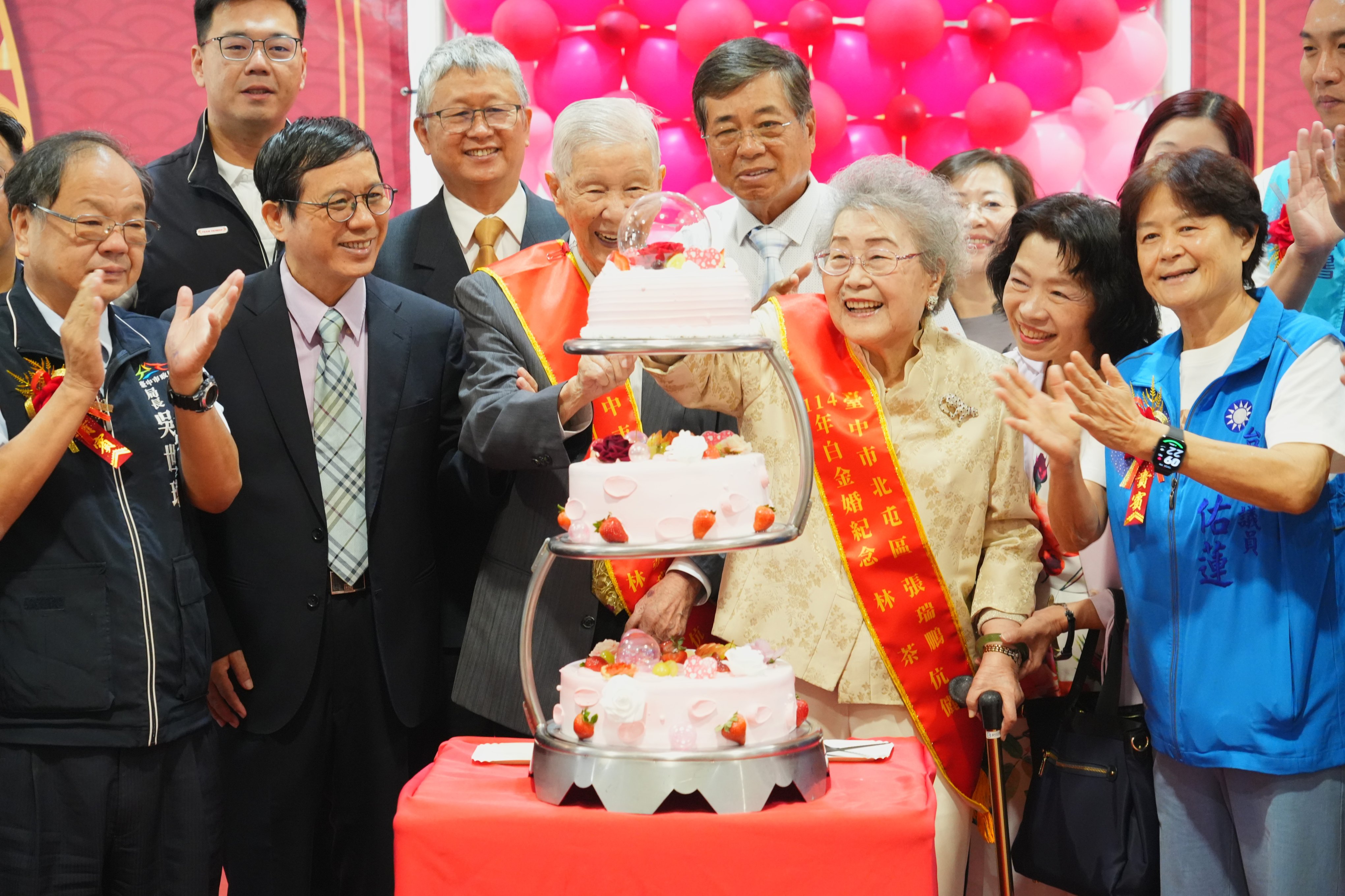 北屯區公所說明,今年受表揚的195對伉儷,婚齡最久為來自大德里的白金婚代表熊肇文、薛鴻霜伉儷,結婚已達74年,高齡百歲的兩人攜手走過近一個世紀的人生旅程,始終相互扶持、恩愛如昔,不僅是一段動人的愛情故事,更是家庭和樂、子孫滿堂的幸福典範。另外平田里金婚代表陳裕益、林月娥伉儷,結縭半世紀,育有一子一女,家庭和樂,陳裕益先生更曾任北屯區長,任內完成區公所大樓興建,見證北屯的成長與繁榮,多年來夫妻攜手共度風雨,至今依舊情感深厚,是地方公認的北屯模範佳偶與幸福典範。