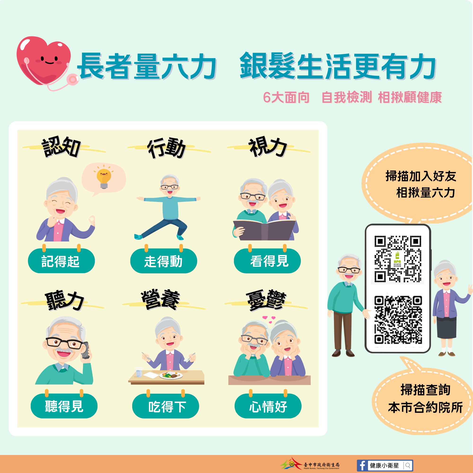 衛生局呼籲,台灣已邁入超高齡社會,長者健康需及早關注。建議65歲以上長者每年進行一次長者功能評估,或在感覺退化時主動檢測,可透過LINE搜尋「@hpaicope」加入國健署官方帳號,使用「長者量六力」數位工具檢視健康狀態,其中「行動力」、「營養力」與「視力」三項與跌倒風險密切相關,也鼓勵家屬協助長輩定期檢視,及早介入預防。