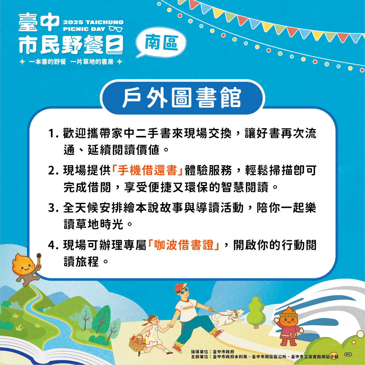 秋意漸濃,最適合在陽光下展開一場閱讀與音樂交織的野餐饗宴! 由台中市政府水利局、南區公所及市立圖書館南區分館攜手舉辦的「2025台中市民野餐日(南區場)」,將於 11月2日(星期日)上午10時至下午2時 在 國立公共資訊圖書館旁園道 盛大登場,活動結束後場地將開放至下午5時,歡迎市民朋友自由前來野餐休憩。
