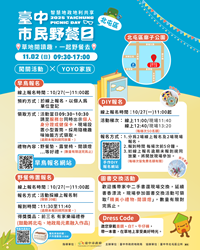 北屯區公所區長陳宗祈表示,現場設有圖書交換區,民眾只要帶來一本書即可與現場書籍自由交換,讓書香在城市間流動不息。此外,DIY手作體驗區將推出「馬賽克杯墊」與「壓花書籤」等活動,適合親子共同參與,留下溫馨的秋日回憶。最具創意的野餐佈置比賽更邀請大家一起「讓環保成為最美的風景」,鼓勵以友善環境素材與在地文化元素打造綠色美學,優勝者還可獲得精美好禮,讓永續理念成為生活態度。