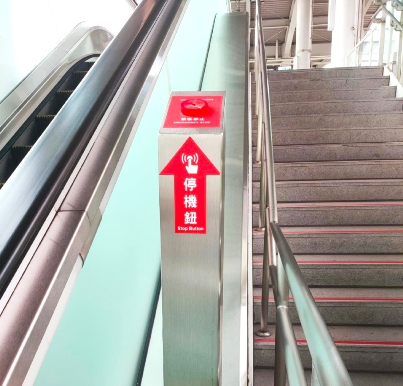 若搭乘電扶梯時發生緊急狀況,如衣物、鞋帶、雨傘尖端或塑膠袋遭夾捲、人員跌倒、鞋底卡入或電扶梯出現嚴重異音、震動、冒煙及異味等情形,請直接用力按下紅色「蘑菇頭」形狀的緊急停機按鈕(不需旋轉),即可停機,並請立即通知站務人員到場協助處理。