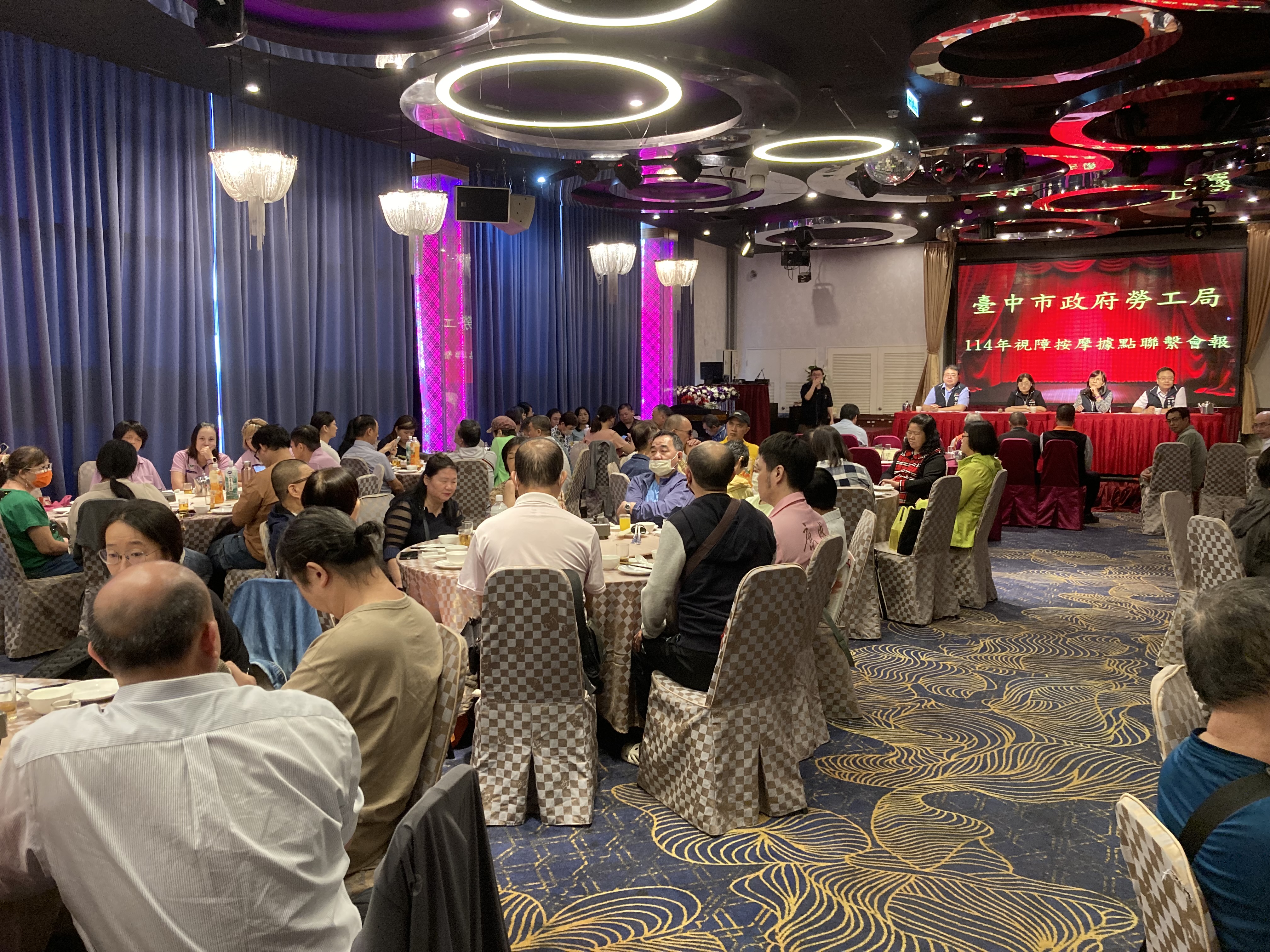 為提昇台中市優良視障按摩據點服務品質,促進公私雙向交流,台中市政府勞工局於10月23日辦理視障按摩據點聯繫會報,邀集各視障團體理事長及幹部、台中教育大學王志宏教授、台中啟明學校校長王敬儒、評鑑與輔導委員及視障按摩師等約130人參加,場面熱絡。