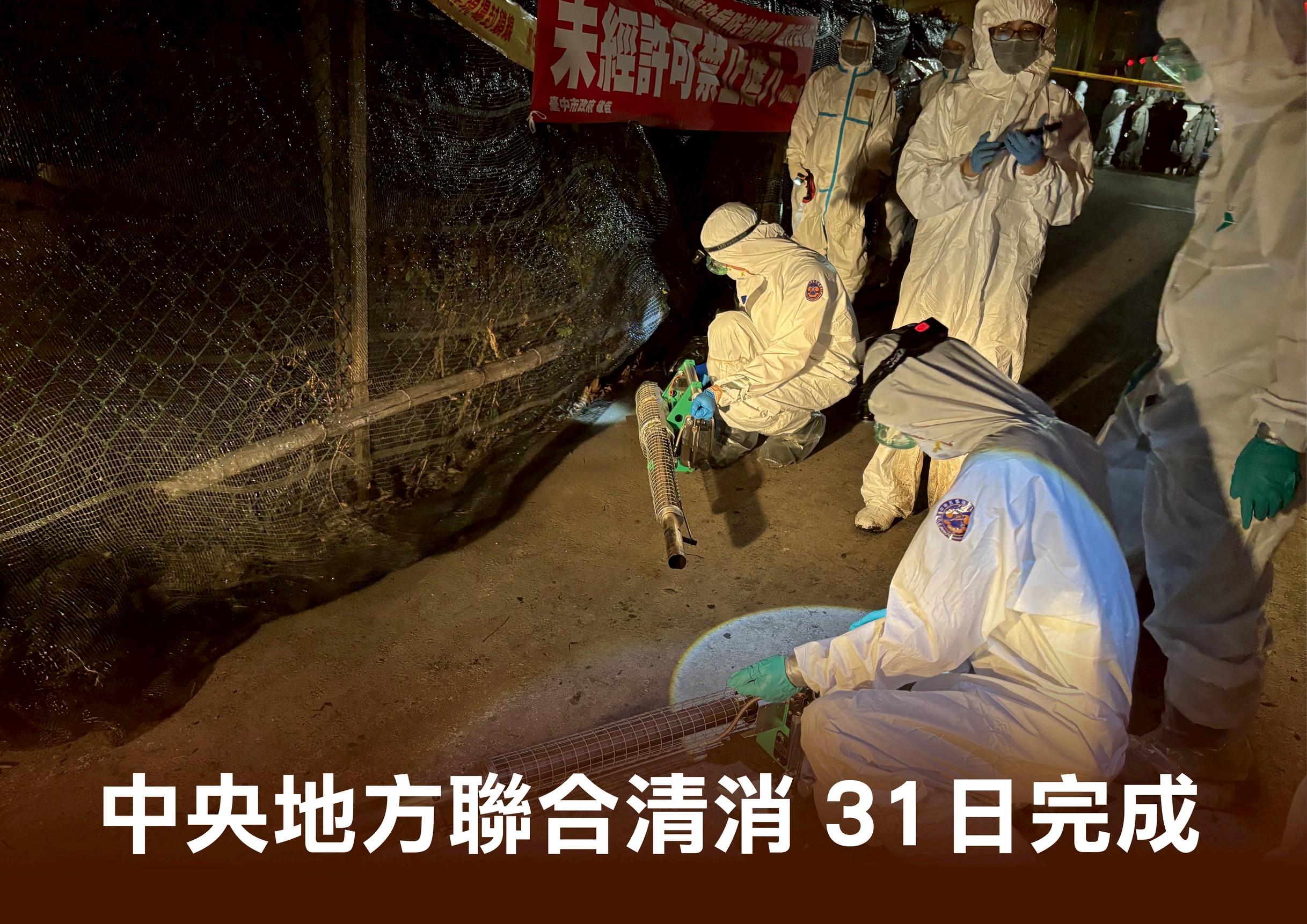 鄭副市長表示,感謝國軍弟兄全力支援防疫,中央與地方昨(31)日晚間完成案例場的聯合清消工作,動員動保處42人次、國軍110人次及化學兵35人次,共187人次投入,徹底刮除地面污泥並由環保局負責清運,確保場域無病毒殘留。