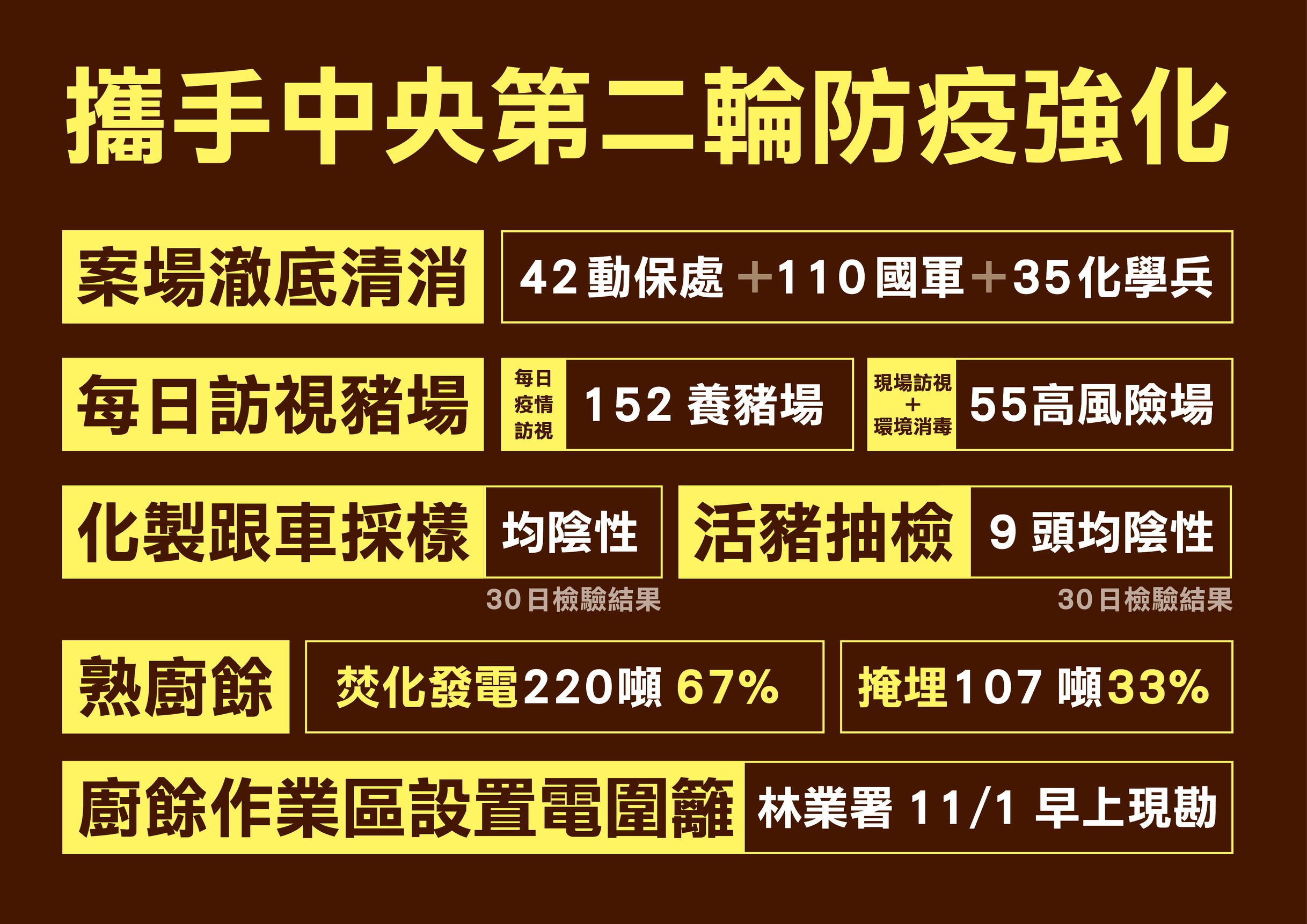 農業局表示,動保處與各區公所動物防疫人員已全面加強養豬場訪查與採檢,截至10月31日止,共完成152場健康檢查,並於26場採血62頭豬隻送檢,結果均為陰性,顯示台中市內豬隻健康無虞。案例場經國軍化學兵支援,環保局清運17噸廢棄物後再度清消,並由警方加強管制,禁止無關人員進入。另每日監控斃死豬數量,目前掌握16場32頭,均依規定完成化製處理。農業局強調,將持續與中央密切合作,嚴防疫情、守護畜牧安全。