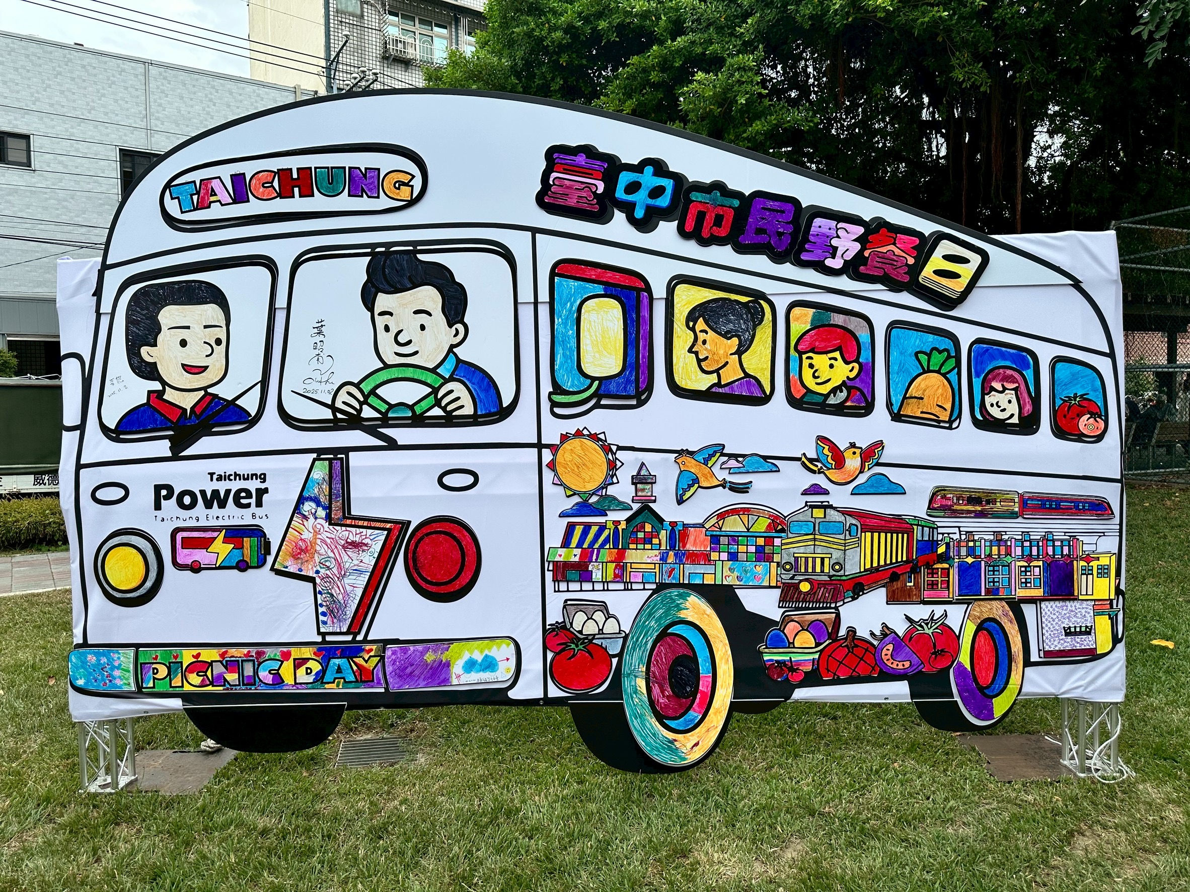 烏日湖日公園活動一早現場便湧入許多熱情的市民朋友,超過100位小朋友熱情參與,在家長們的陪伴下盡情揮灑創意,作品充滿童趣與想像力。孩子們的畫作最後拼貼成一輛繽紛亮眼的「幸福公車」,象徵大家共同編織城市的美好旅程。繽紛的色彩、純真的笑容,讓整體作品更添溫暖與活力,現場掌聲與笑聲此起彼落,洋溢著滿滿幸福感,並與「幸福公車」留下珍貴的親子合影。