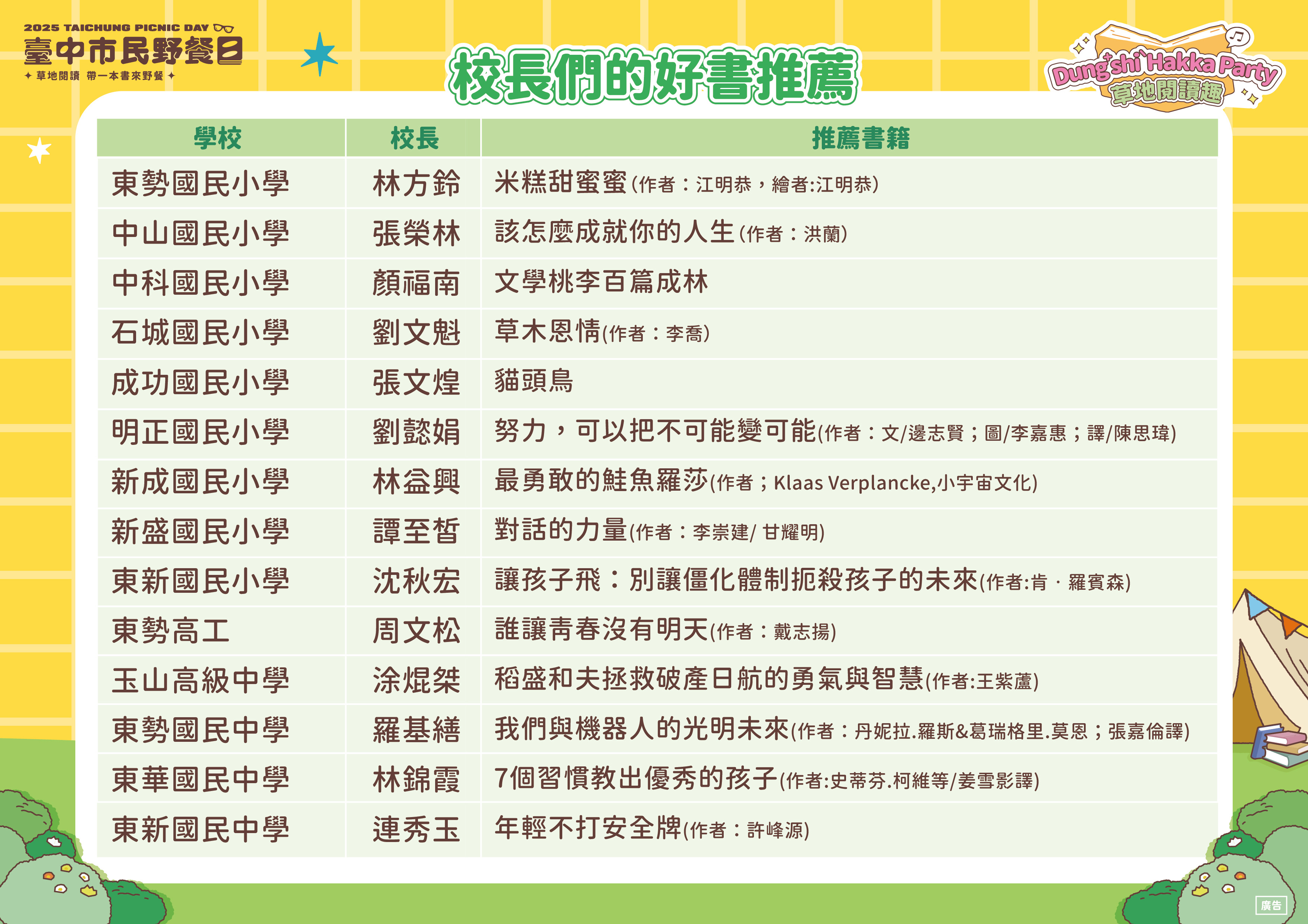 客委會主任委員江俊龍表示,今日特地邀請東勢區的各校校長,化身成為智慧、守護與教育的貓頭鷹,進行好書推薦,帶領大家探索閱讀的樂趣,希望大家在野餐日能輕鬆享受美好的氛圍。江主委為大家推薦最近閱讀的一本好書─「聯合文學-邱妙津專號」,邱妙津是當代著名的作家,透過閱讀這本書能更了解作家的生平交遊和深刻的情感以及當代文學思路。