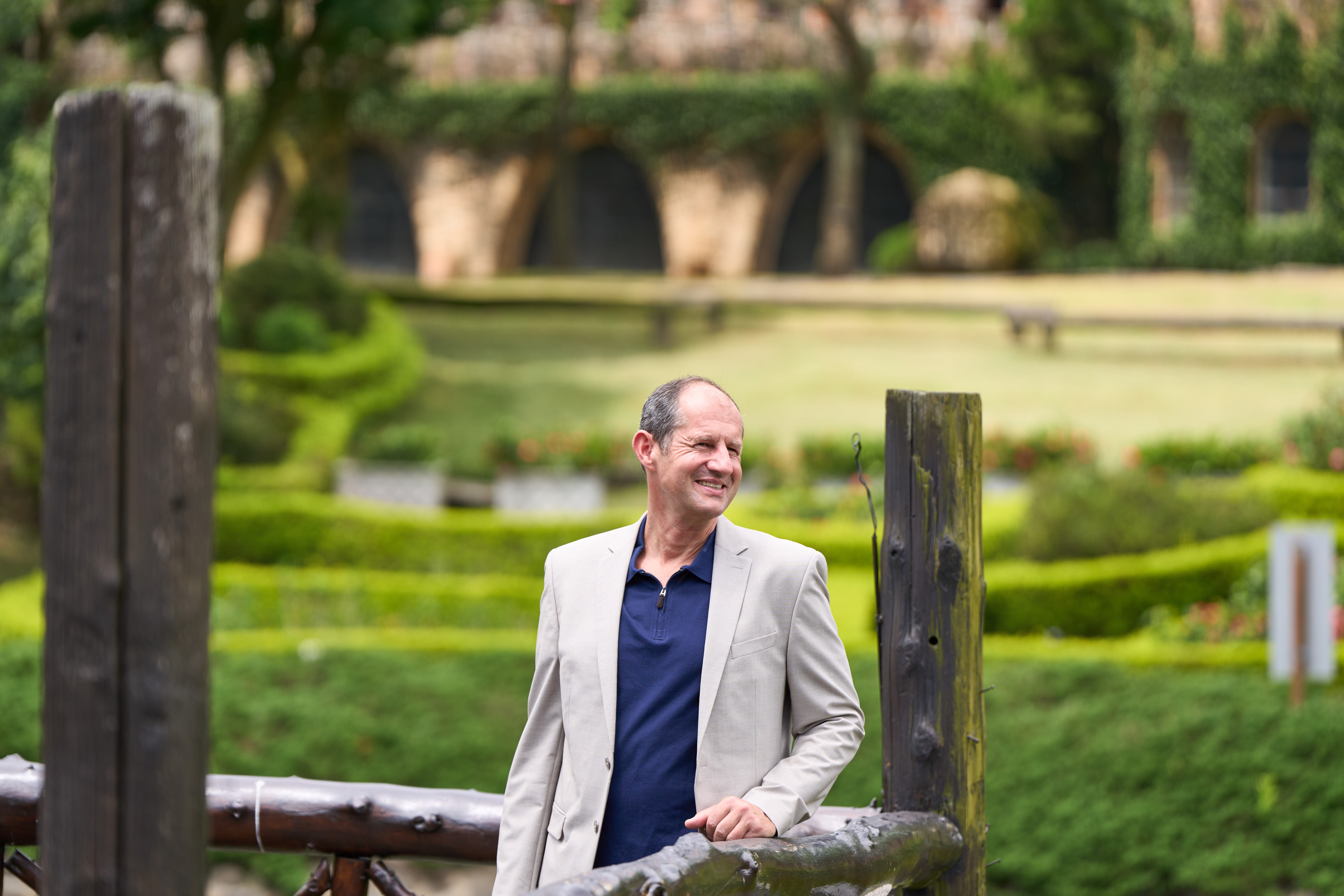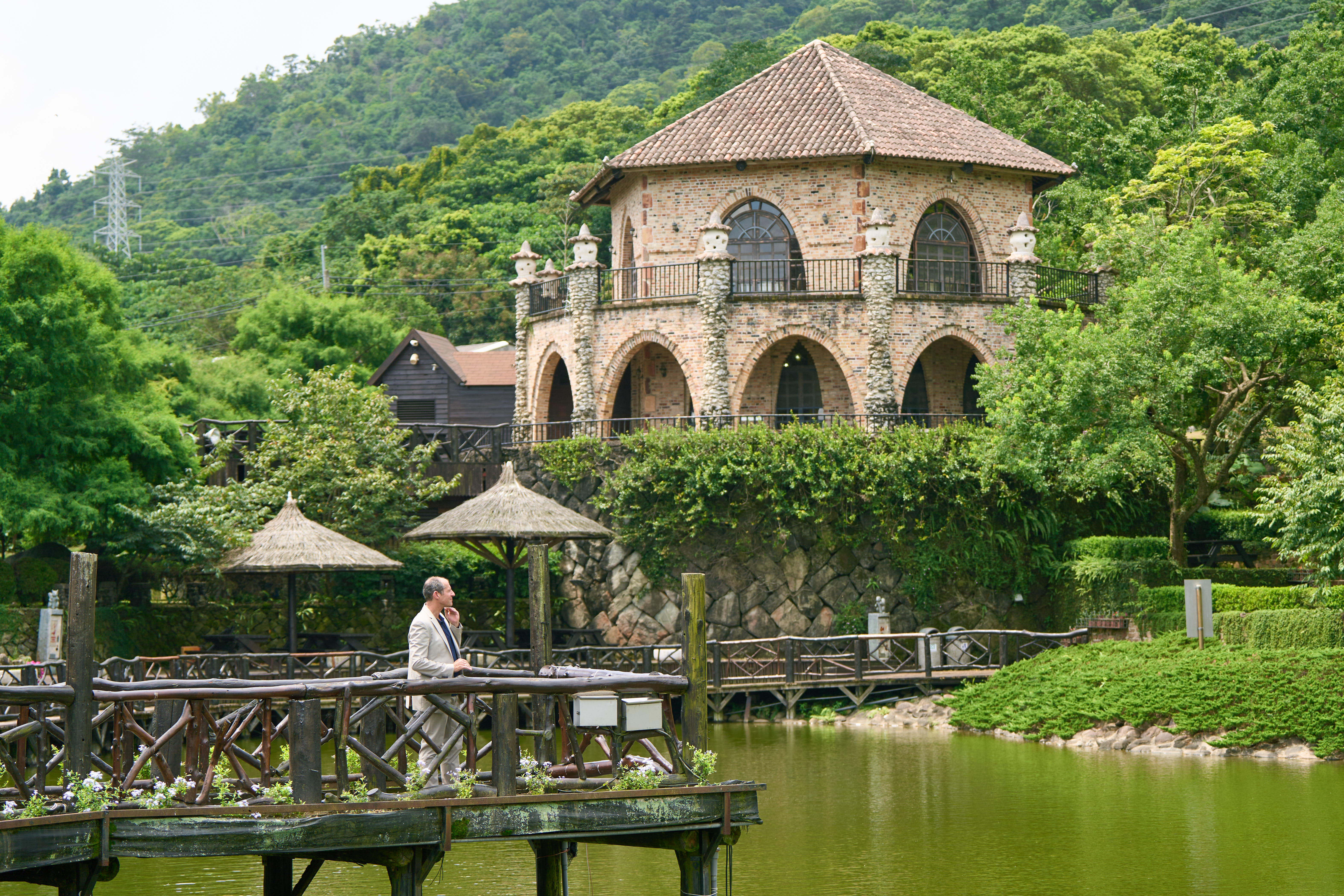 經發局說明,為了這場跨國行銷合作,谷力哲處長一早自台北搭高鐵南下,一身輕便休閒西裝散發十足紳士風格。此次拍攝首站於「一秒置身歐洲」的新社古堡莊園,在湖光山色、瑰麗古堡中,谷力哲處長與黃金獵犬一同入鏡,漫步、感受清新空氣,他對於能在市區不到半小時車程體驗歐式建築感到驚訝,感嘆不到20年的建築可以復刻百年歐式古堡,自然、獨特又真實!