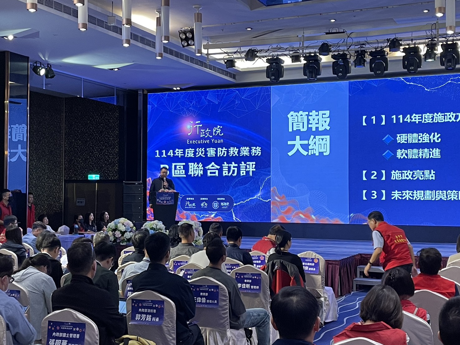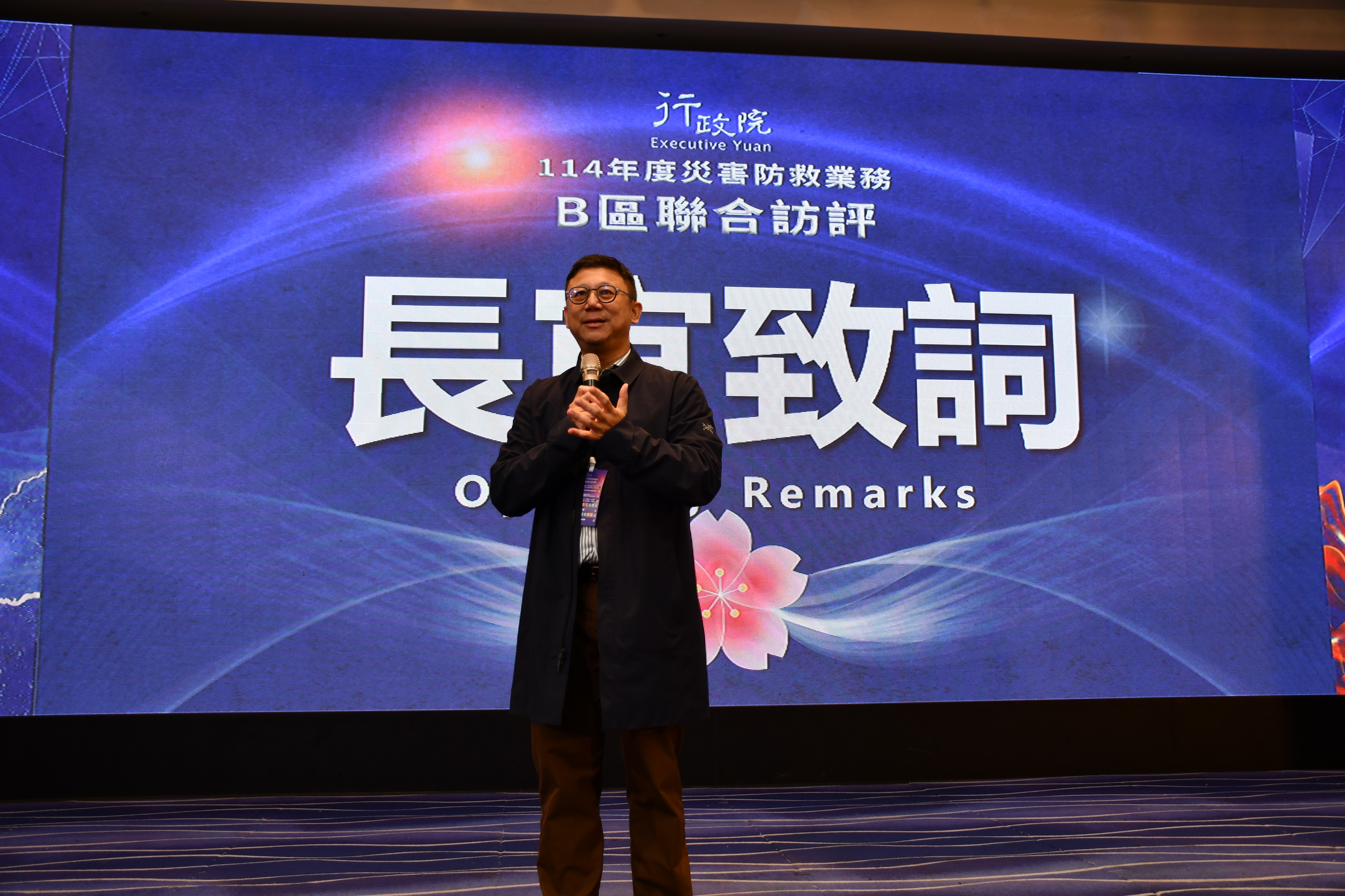 行政院114年度災害防救業務B區聯合訪評,今(4)日在台中市好運來洲際宴展中心舉行,由經濟部主任秘書莊銘池,率行政院災害防救辦公室等中央24個部會長官約90人蒞臨會場評核,共同邀集台中市、新竹縣、苗栗縣、南投縣、彰化縣、金門縣及澎湖縣參訪人員合計約650人。台中市府副秘書長張大春代表台中市歡迎中央部會長官與各縣市防災夥伴蒞臨,期許共同強化災害防救量能,開創防災新視野。