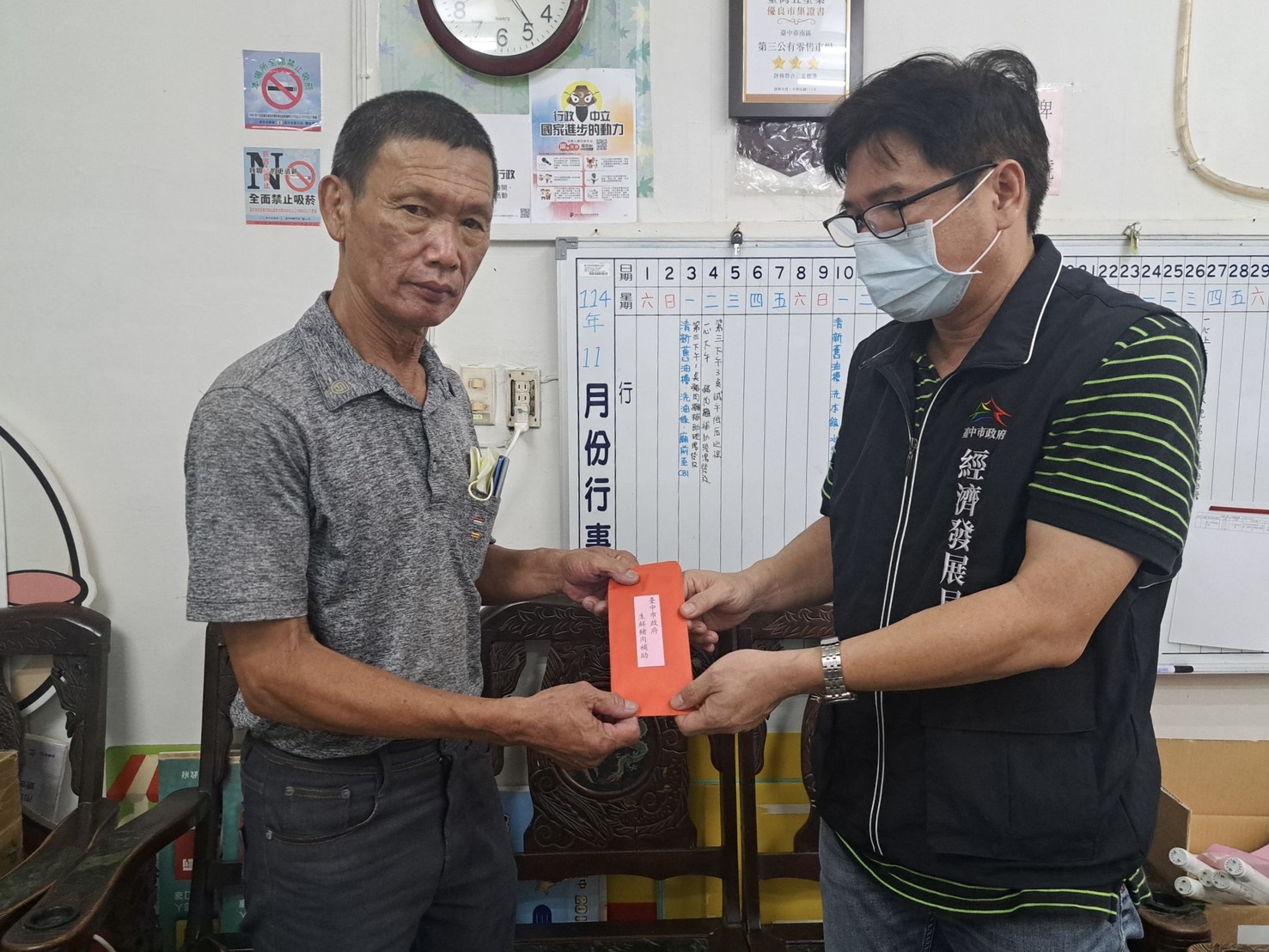 為掌握發放進度與攤商實際需求,張局長親赴烏日市場視察,與現場攤商交流意見,瞭解補助執行情形及市場營運狀況,展現市府積極傾聽基層聲音、落實政策的決心。他強調,市府將持續關注市場經營狀況,透過即時應變與多元協助機制,攜手攤商共度挑戰,穩定民生供應與市場秩序。(11/4*7)*經發局