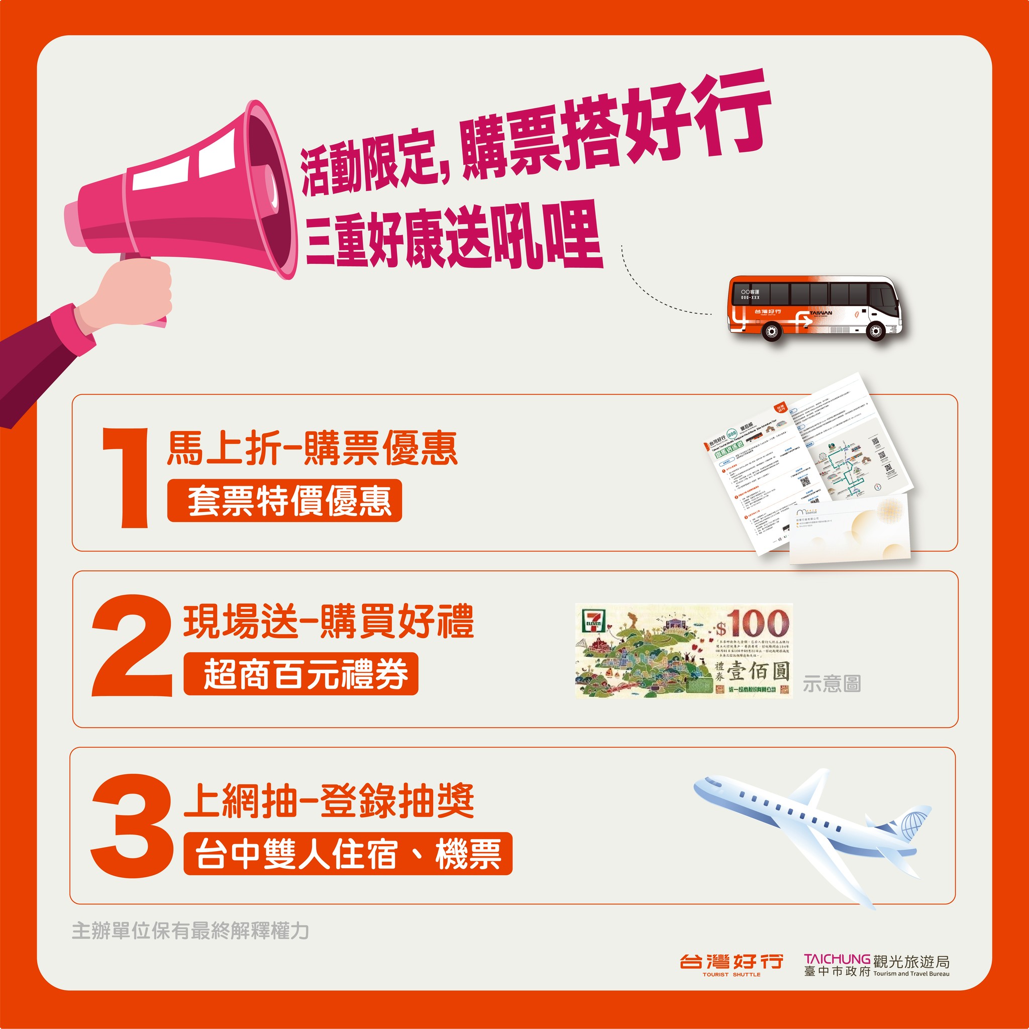 台中市政府觀光旅遊局表示,為響應永續旅遊與淨零轉型政策,此次展攤特別推廣低碳旅遊概念,透過「台灣好行」串聯台中山、海、屯、都各區旅遊亮點,展現兼具便利、環保與創意的交通旅遊體驗。現場購買「台灣好行」套票的旅客,可享旅展限定「馬上折」、「現場送」、「上網抽住宿機票」等3重好康,包括獲得展場限定優惠價、加碼贈送超商百元禮券,以及憑票登錄參加台中雙人住宿券與機票抽獎等好康,輕鬆開啟秋冬綠色旅遊行程。