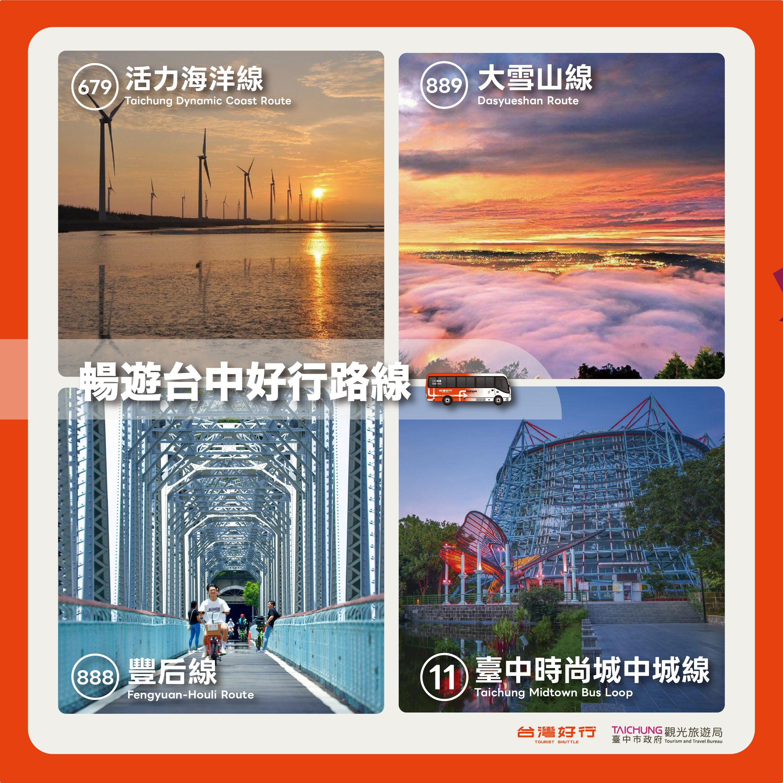 觀旅局補充,市府未來將持續推動「台灣好行」路線與各大景點、活動串聯,結合地方文化、節慶與觀光亮點,打造更多元的旅遊體驗,讓民眾以更環保、便捷的方式探索台中。誠摯邀請全國民眾蒞臨2025ITF台北國際旅展台中館,體驗趣味互動、限量好禮與超值優惠,一起用行動支持低碳旅遊,發現台中的山海魅力與永續精彩!(11/6*10)*觀旅局