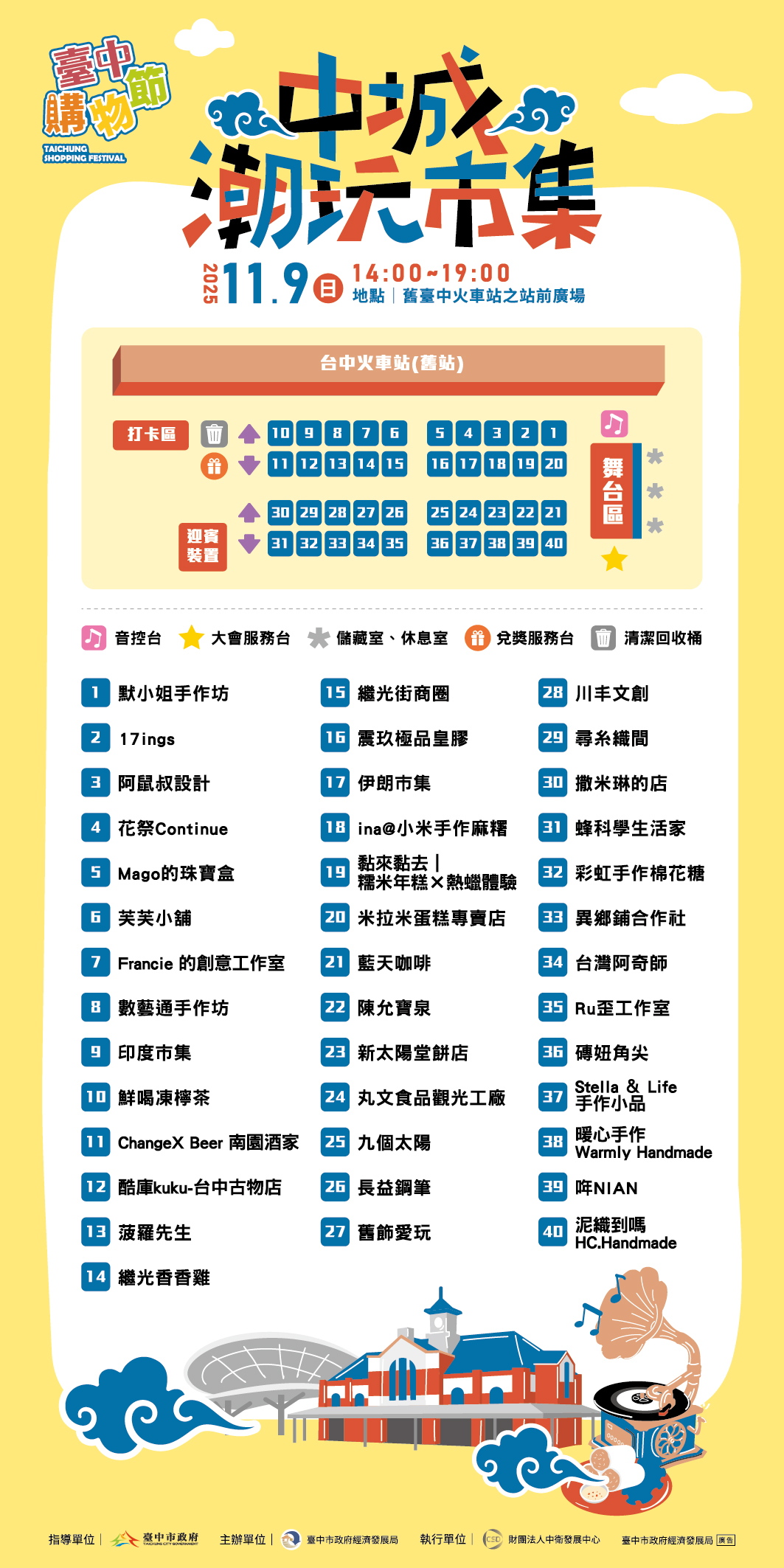 經發局說明,此次市集邀集多元特色攤商現場設攤,如中區百年老店「陳允寶泉」、道地伴手禮「新太陽堂餅店」、「九個太陽」及「丸文食品」,現場除豐富的攤位展售外,更規劃多場精彩表演與互動活動,包括音樂開場秀、魔術氣球秀、花式籃球演出等,讓現場氣氛熱烈不斷。活動同時結合「台中購物節」推出加碼抽獎與集點活動,只要於市集消費滿額或拍照打卡上傳社群,即可兌換限量福袋及抽獎券。活動當日抽出總價值超過十萬元的豐富獎項,包括Dyson吹風機、空氣清淨機、AirPods及遠東百貨禮券等多項好禮,讓民眾享受在舊城探索的美食旅程,還有滿滿好禮帶回家。