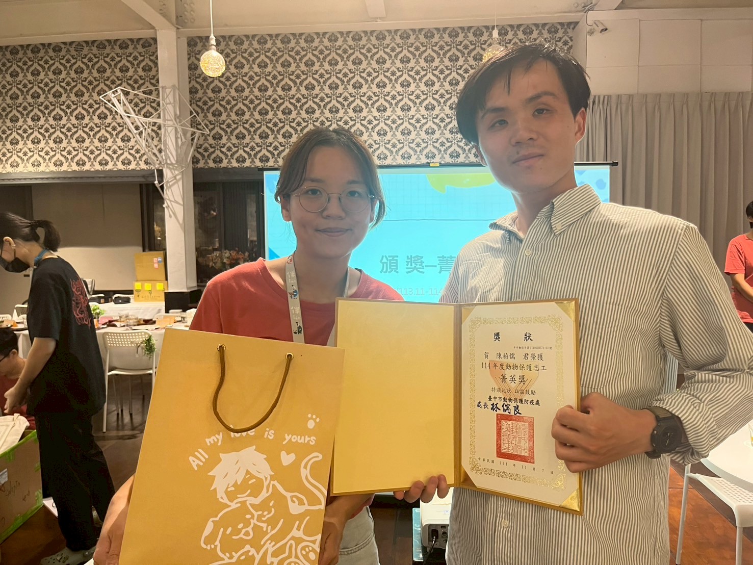 動保處於今(7)日舉辦「114年動物保護志工聯繫會暨期末表揚活動」,感謝志工們一年來的熱情投入與默默付出,特別頒發服務時數前3名菁英獎及感謝狀以表彰志工無私的奉獻與精神,其中14位志工年資滿一年且服務時數破百,獲頒桃紅色背心成為資深志工!