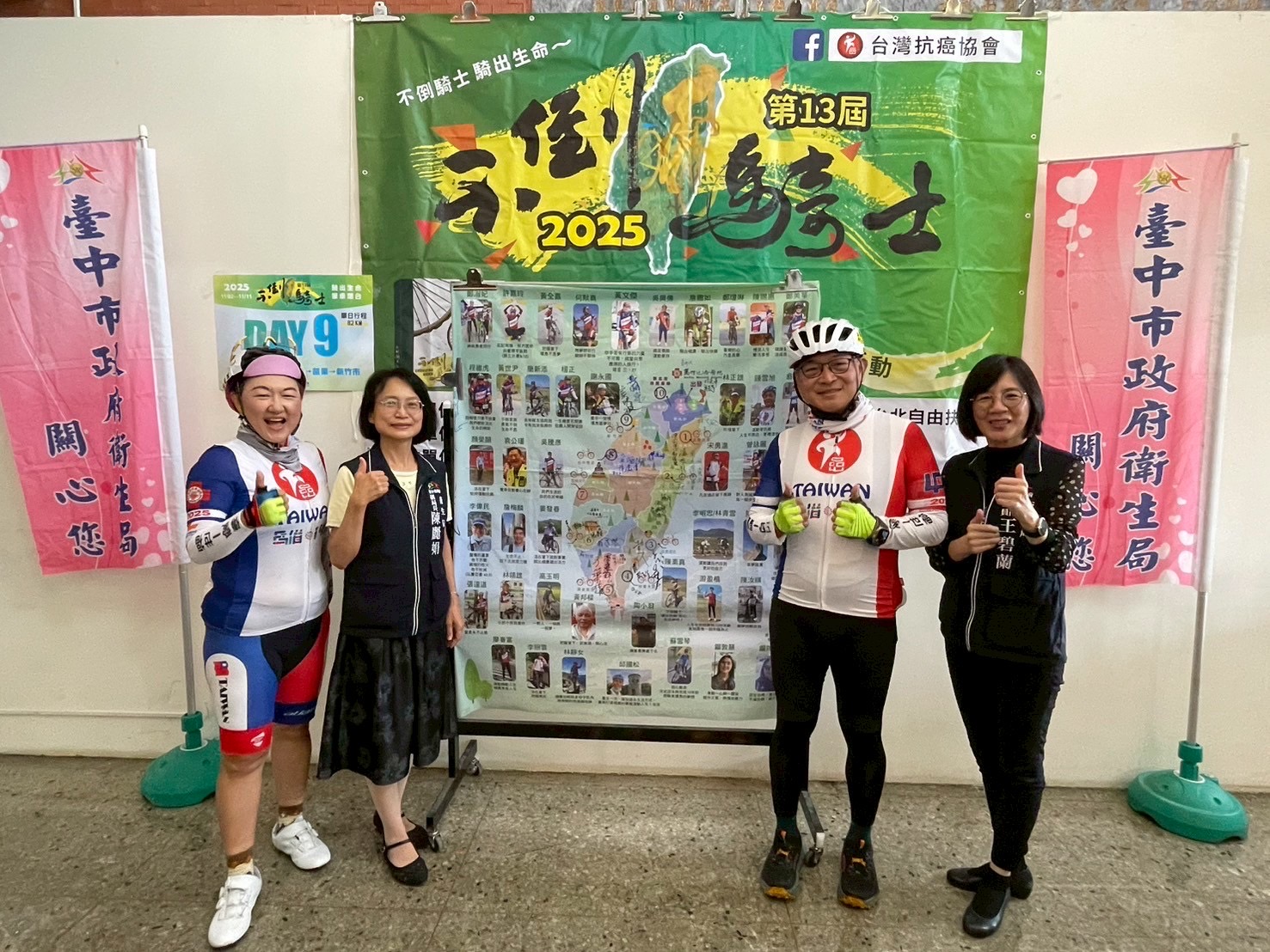 台灣抗癌協會第十三屆「不倒騎士 騎出生命」單車環台活動今(10)日抵達台中市政府衛生局,由衛生局副局長陳麗娟率領團隊熱情迎接抗癌勇士。衛生局表示,「不倒騎士」以親身抗癌歷程鼓舞病友及家屬投入運動行列,展現「運動抗癌」的堅毅精神。活動中,騎士們也分享運動對抗癌症的心路歷程,陳副局長呼籲市民養成規律運動與健康生活習慣,並定期接受癌症篩檢,達到預防與早期發現的雙重防護。