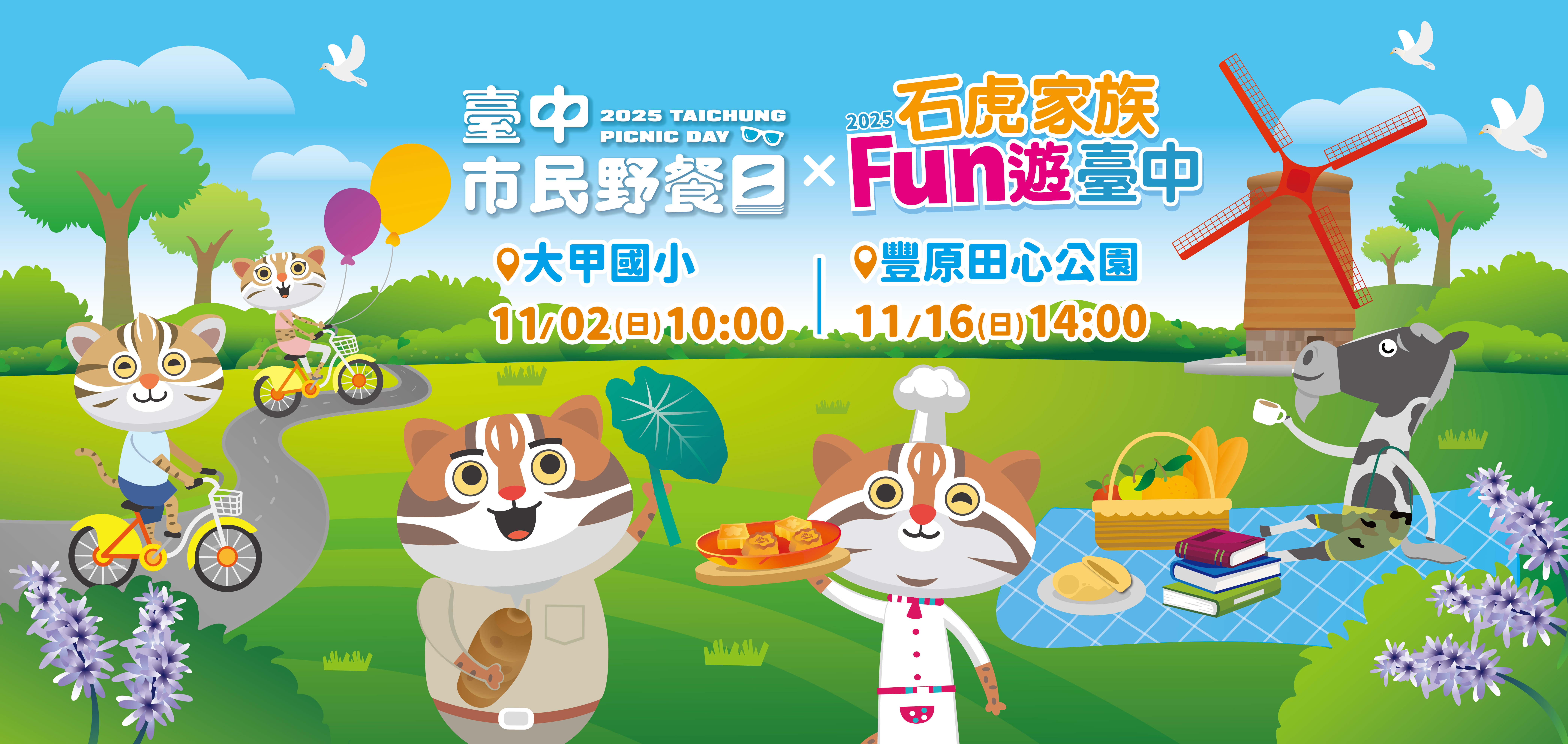 2025台中市民野餐日1116日將於豐原田心公園舉辦,「石虎家族與歐米馬」5隻吉祥物全員集體出動,千萬不能錯過!台中市政府新聞局表示,除了可愛吉祥物與市民朋友面對面,還有YOYO家族人氣明星KIWI姐姐、柳丁哥哥及蔓越莓姐姐帶小朋友盡情唱跳放電,現場更設有親子館體驗、互動遊戲攤位、文創市集;另,民眾上傳照片至「石虎家族Love&Life」臉書粉絲專頁就有機會參加抽獎,豐富活動和精彩表演陪市民度過快樂的週末時光。