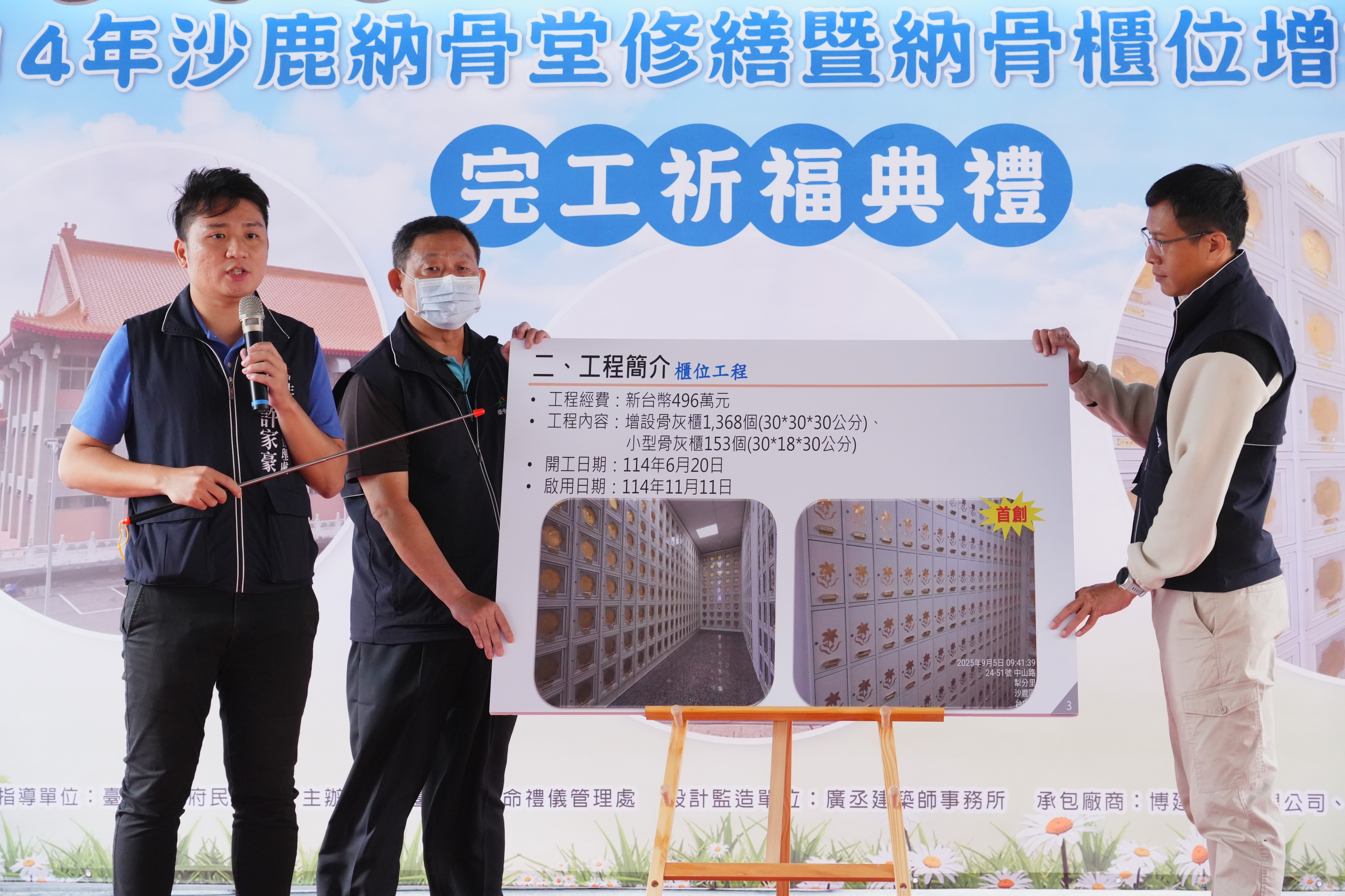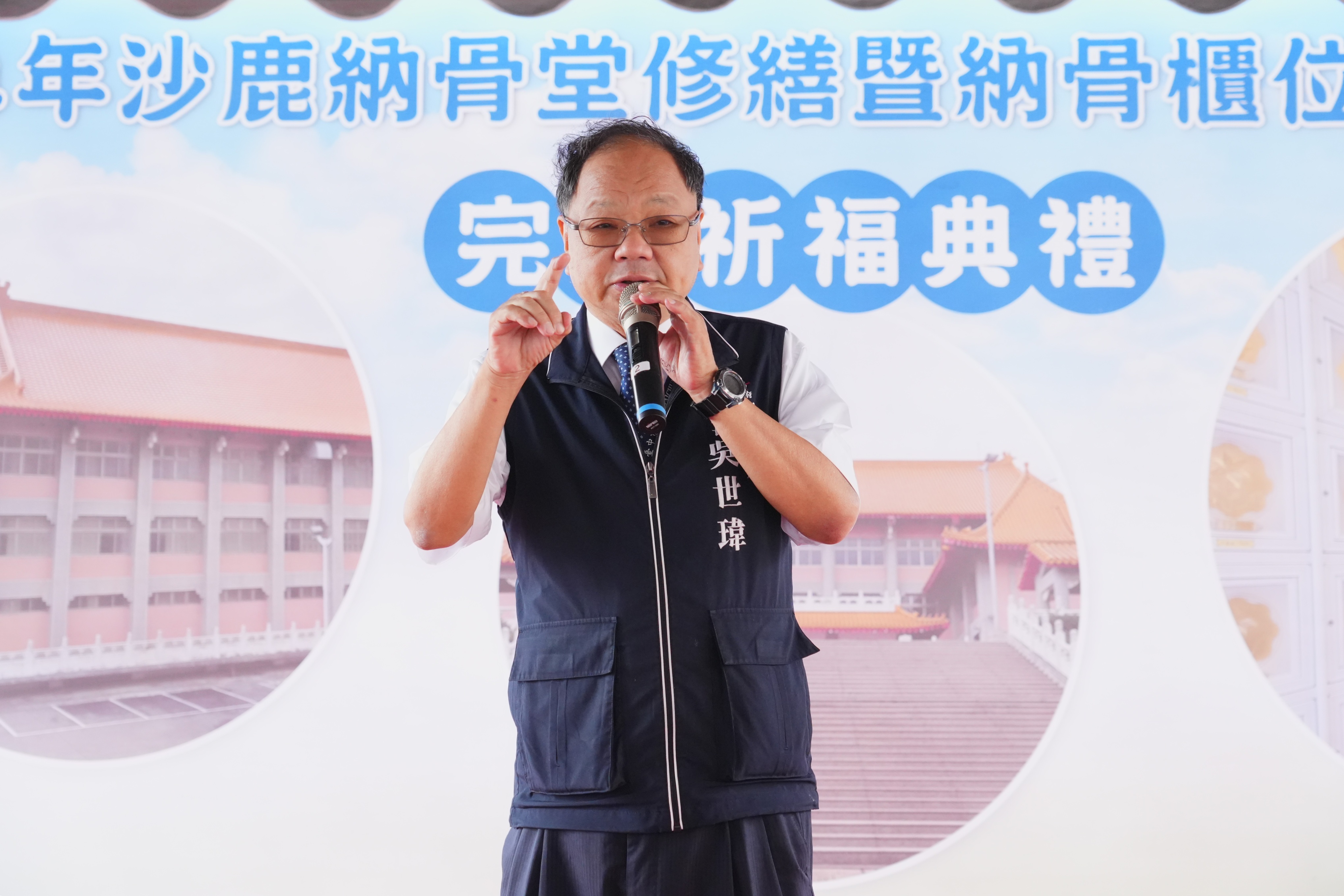 吳局長指出,盧市長上任以來高度重視公共空間的安全品質,不僅積極推動新建納骨塔,也持續強化既有殯葬設施的維護與修繕,除此次完工的沙鹿納骨堂,今年也陸續推動大肚山納骨塔建物修繕及梧棲納骨塔耐震補強等工程;同時積極推動樹葬、海葬等環保自然葬,今年在大肚山納骨塔及沙鹿區納骨堂也新設樹葬區,提供1,500個穴位,全面提升殯葬設施服務品質,並感謝市議會對預算的支持,讓各項工程順利推動,確保先人安息、民眾安心。