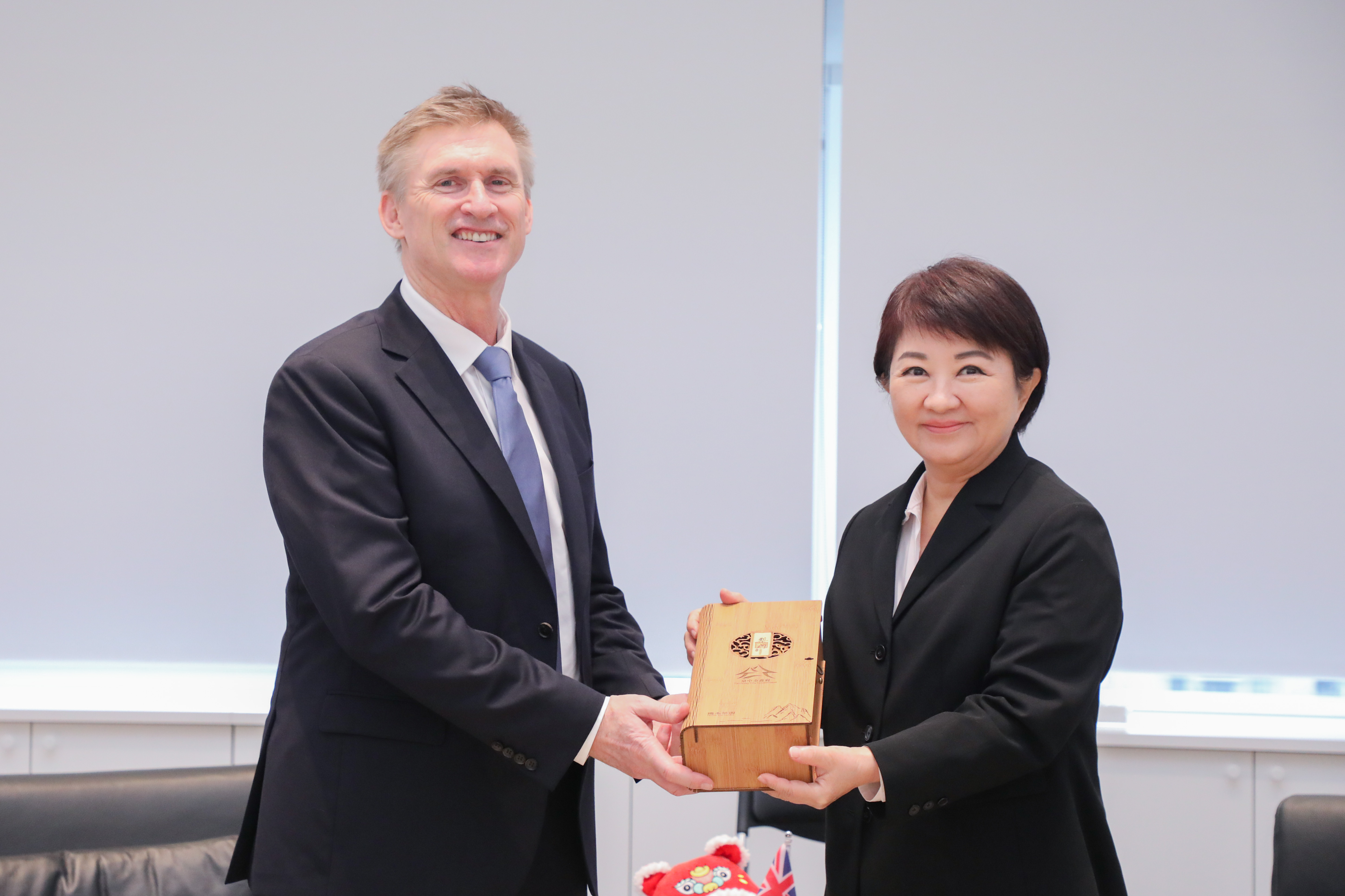 今日梁代表到訪,市府除盧市長外,副市長黃國榮、教育局長蔣偉民、文化局長陳佳君、秘書處長謝佳蓁也一同到場交流,雙方並互贈和平區烏龍茶與紐西蘭產葡萄酒,現場互動氣氛熱絡。