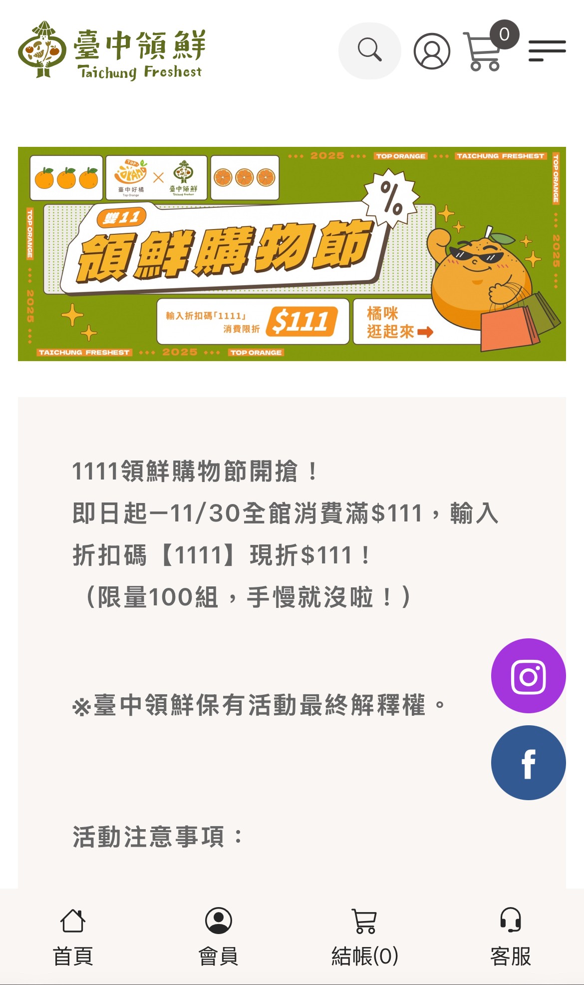 由台中市政府農業局推動的「台中領鮮」電商平台活動—「台中領鮮購物節」正式登場!即日起凡至「台中好橘」電商平台購買商品,並於結帳時輸入優惠碼「1111」即可享有111元現金折扣,數量有限、送完為止。活動集結台中在地優質農特產品,讓民眾在雙11購物檔期中輕鬆選購,實際支持台中農業。