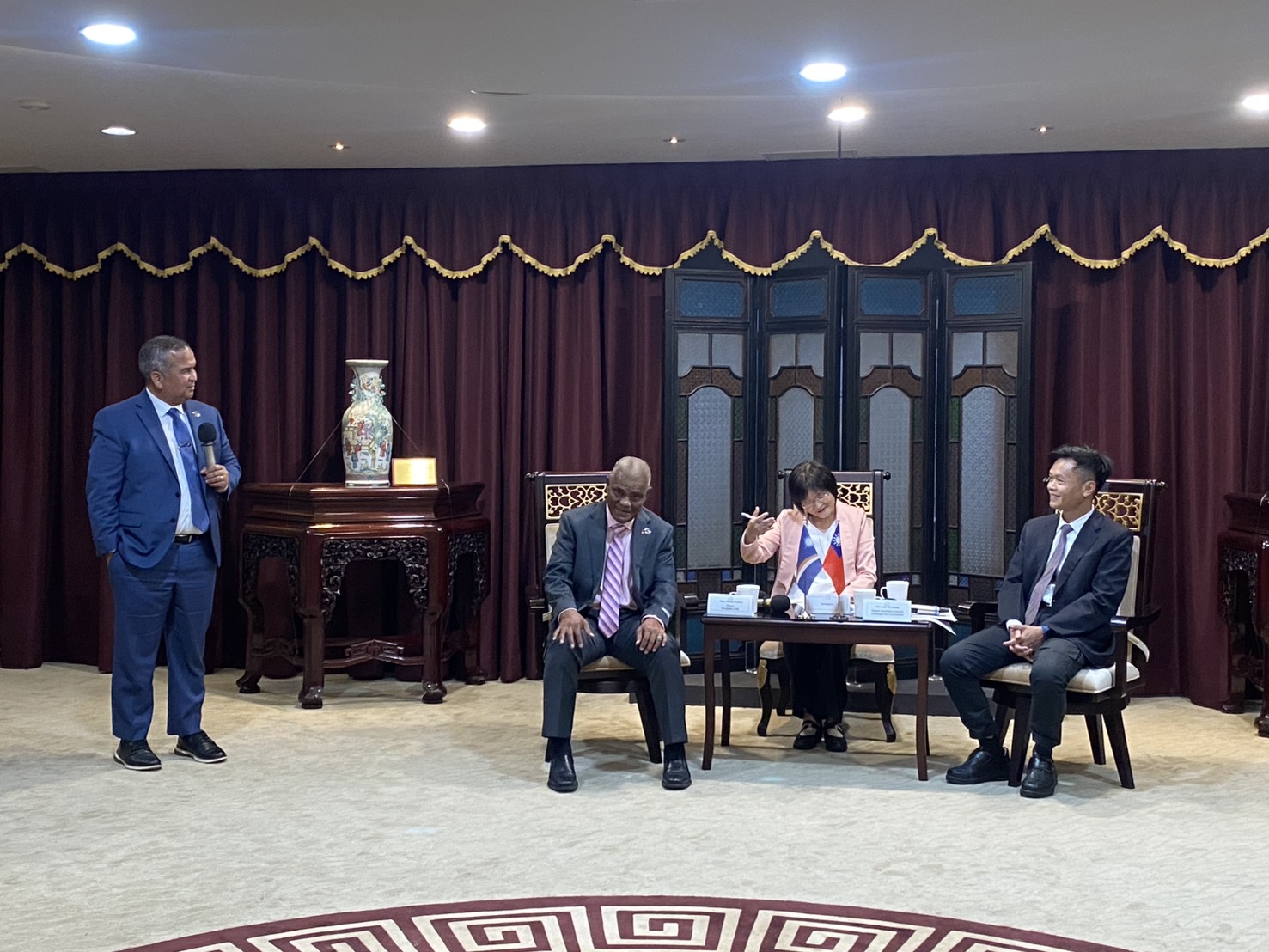 今日會談溫馨熱絡,與會來賓包括馬紹爾群島共和國財政部長包大維、姊妹市瓜佳蓮市長柯布亞、馬紹爾群島共和國卡蒂爾大使等出席交流;市府除副秘書長林育鴻,國際事務委員會執行長令狐榮達、文化局副局長施純福、秘書處副處長李政峯、觀光旅遊局主任秘書廖偉志、農業局主任秘書黃春滿、經濟發展局專門委員龍明成亦陪同出席。(11/13*17)*秘書處