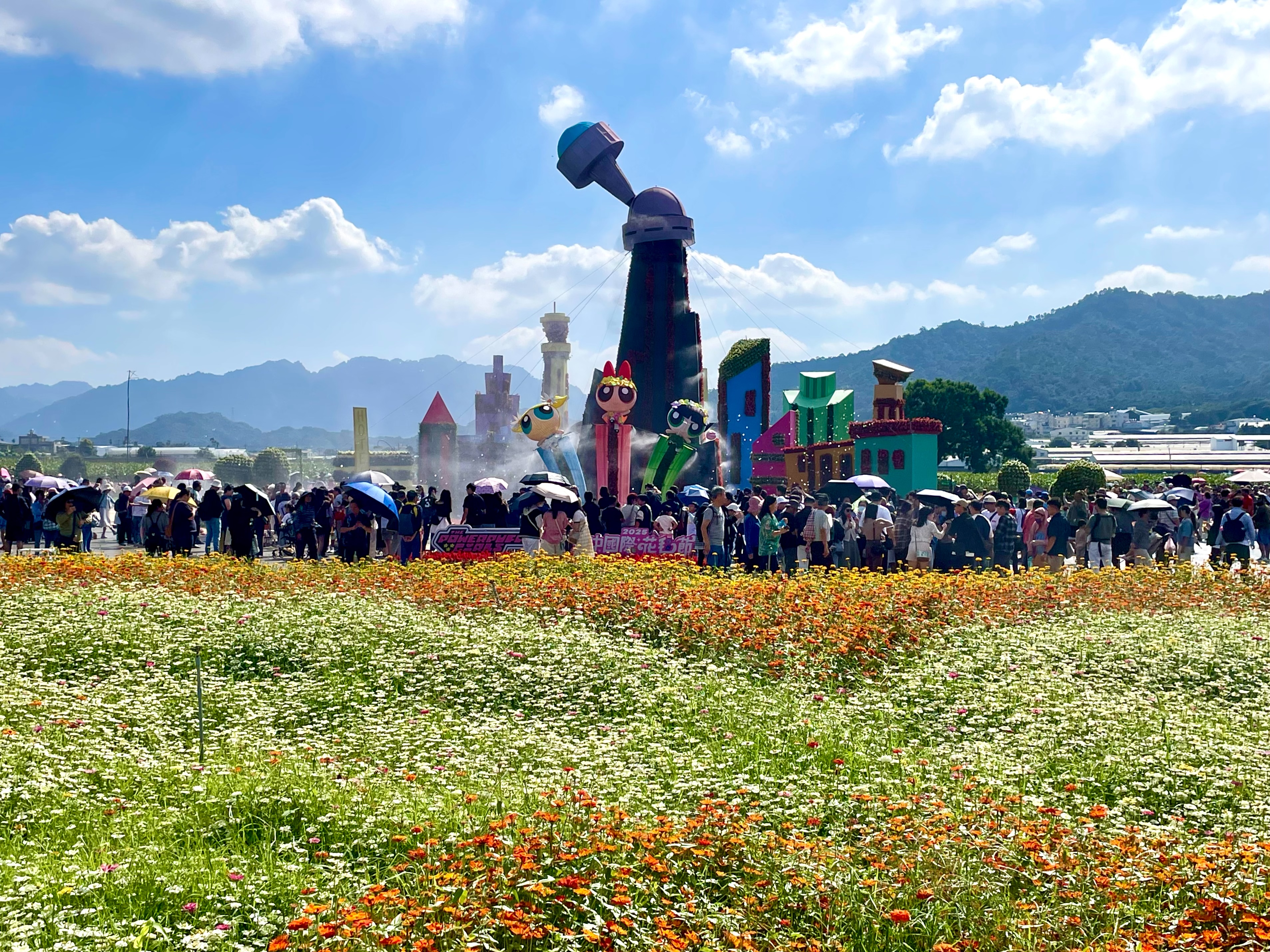 觀旅局指出,今年花毯節主題結合知名卡通飛天小女警,以史上最大規模的主花毯(高18米、直徑60米)為核心,每日上演泡泡與水霧特效搭配機械動態自動展演,持續吸引大批遊客駐足拍照。花毯內更設置盪鞦韆、甜甜圈店等場景,讓大小朋友都能參與其中。除了主花毯外,現場裝置也驚喜呈現飛天小女警的家、市政廳等經典場景,還有尤教授、小鎮村市長、會說話的狗等角色立牌,以及魔人啾啾、粗暴小子、阿米巴幫、壞死幫派、「他」等反派立牌,豐富的角色元素彩蛋讓遊客直呼「花毯節不只是花海,更是童年的夢想」。