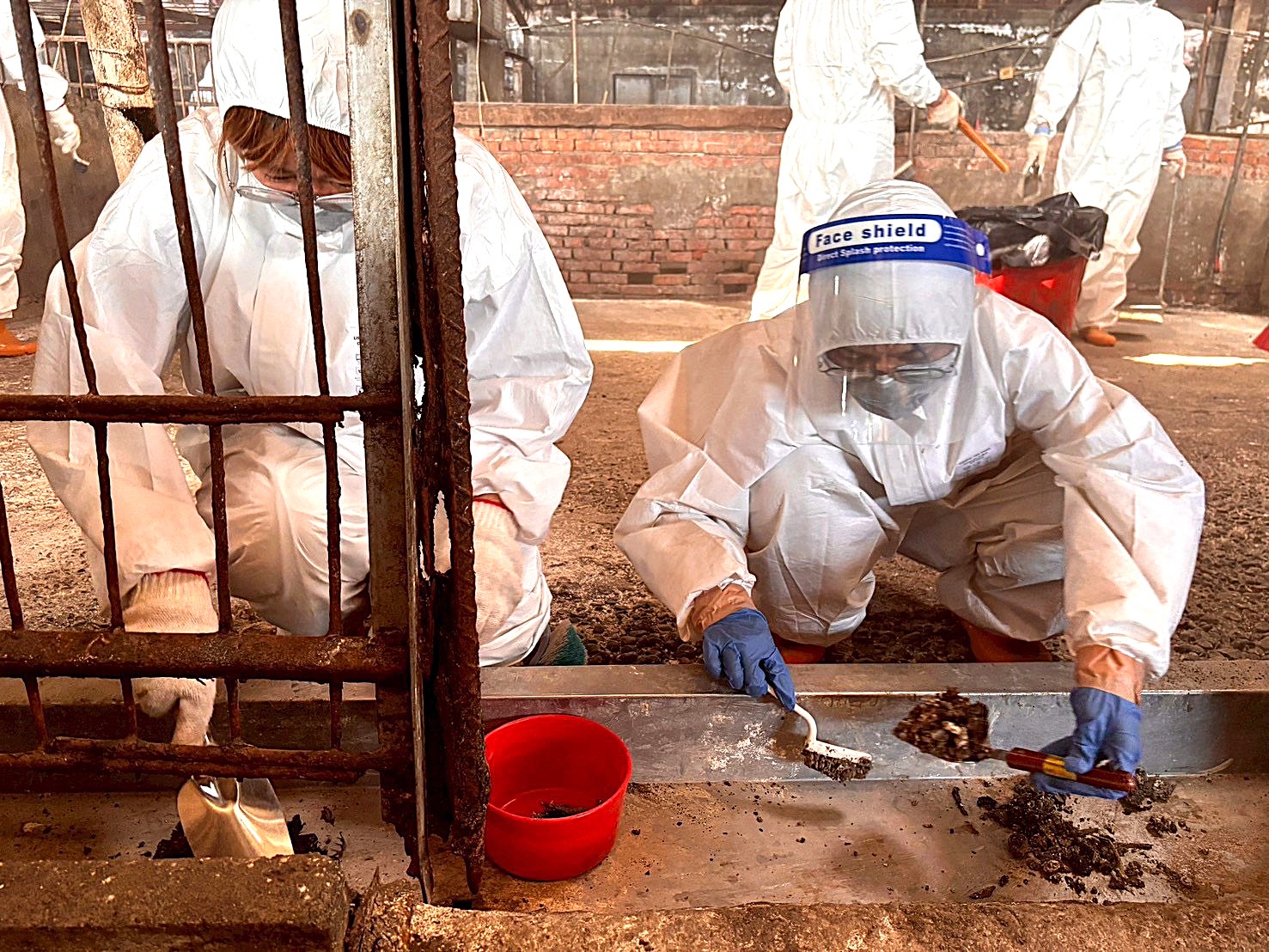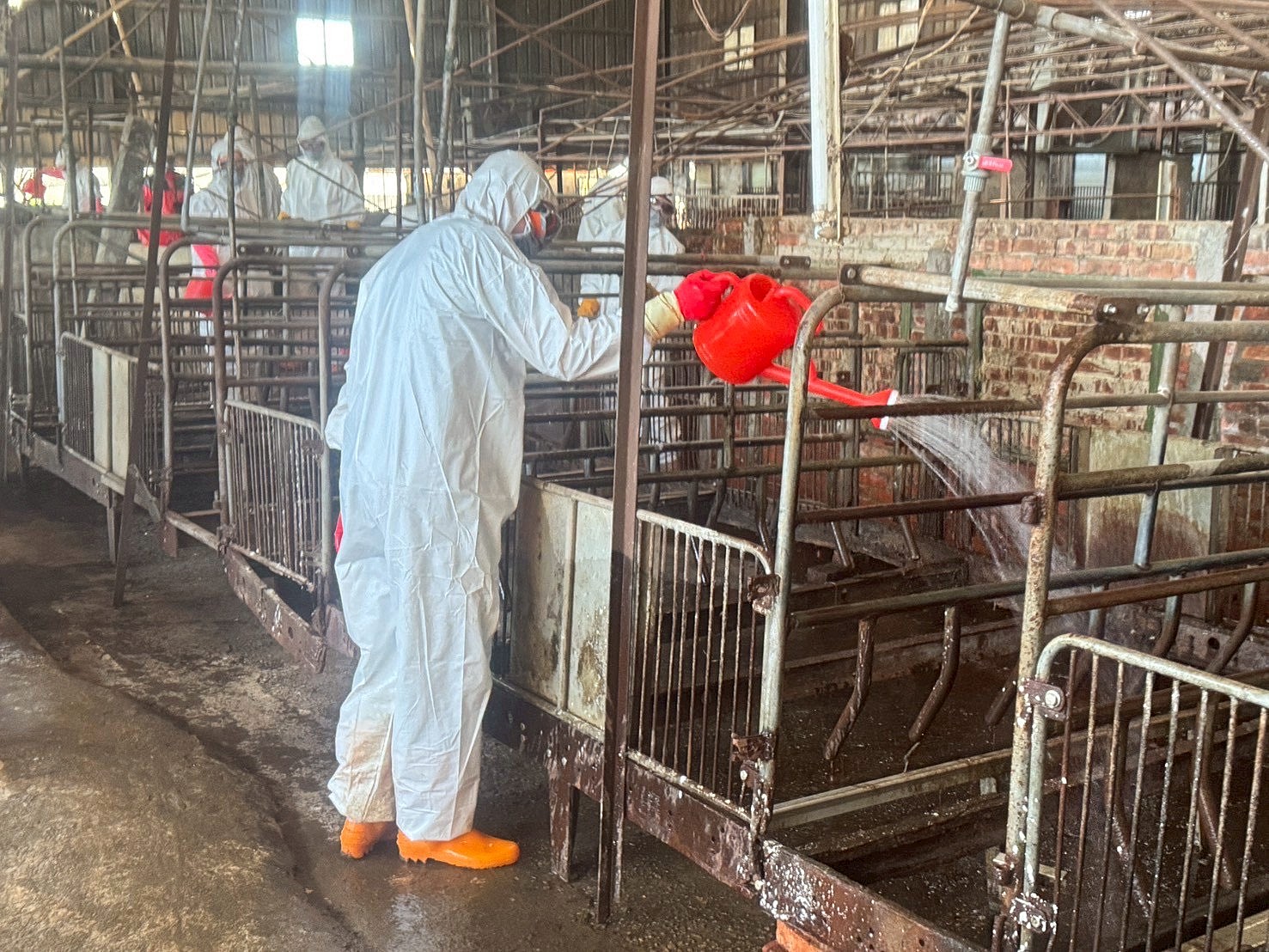 今日則在農業部獸醫研究所3名專家進場指導下,以鹼片溶液進行地面、牆面及各項設施的全面消毒,市府動員13人次配合作業。由於鹼片具強腐蝕性,現場人員全面提升防護等級,穿戴護目鏡、口罩、防護衣等全套裝備,並採兩組由內而外方式分區淋澆、浸潤式消毒,包含孔洞、牆角、動線轉折及冰箱內外均納入加強範圍。