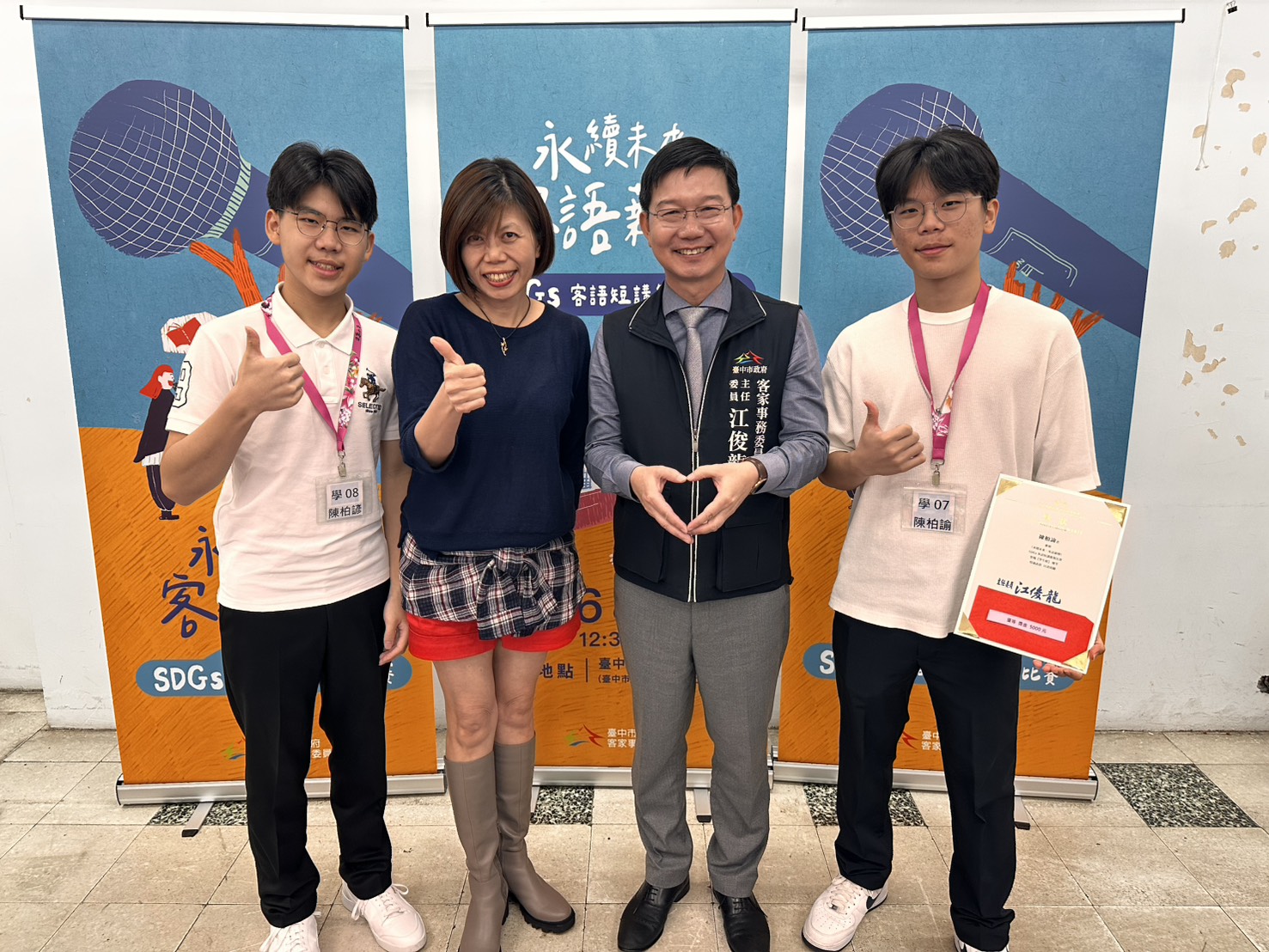 客委會主委江俊龍表示,永續發展不僅是全球趨勢,也是地方文化永續的重要使命,今年中市府創全國之先,首次辦理客語短講簡報比賽,期許透過此活動,鼓勵年輕人用客語談論氣候變遷、性別平權、減碳行動、教育創新等議題,讓「講客語」與「談永續」相互連結,成為在地文化與全球視野的聚焦點。今天的比賽吸引許多民眾報名,有母子、母女、兄弟各自選組別報名參賽,全家熱烈響應此活動非常可喜,讓人感動值得讚許!