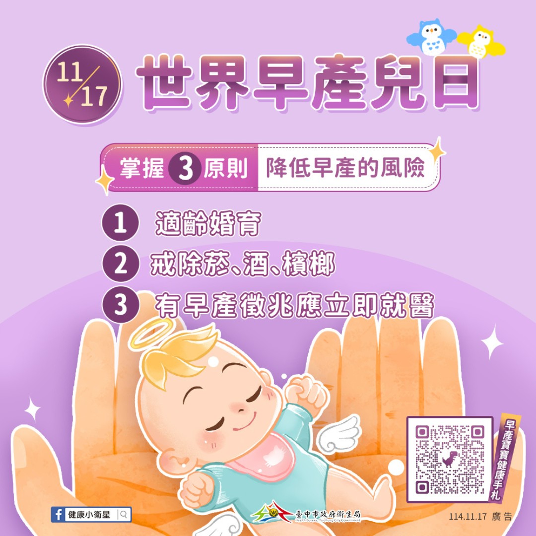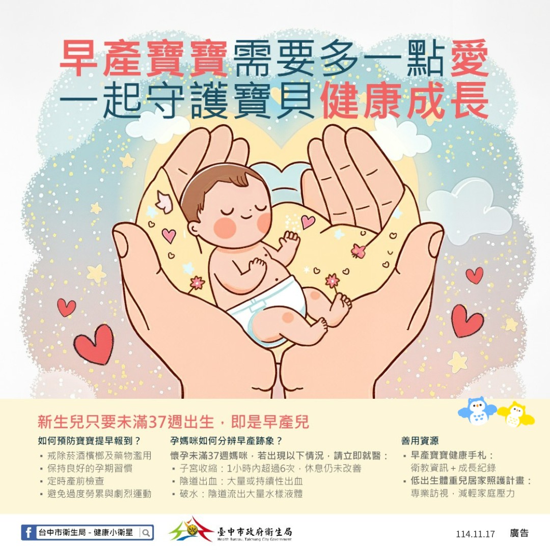 為提醒社會大眾關注早產議題,每年11月17日為「世界早產兒日」,新生兒只要未滿37週出生,即是早產兒。台中市政府衛生局表示,照顧早產兒的過程中,難免會有較多的擔心及壓力,配合衛生福利部國民健康署推動低(含極低)出生體重兒居家照護計畫,市府衛生局提供早產家庭所需的支持與協助。