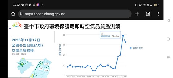 環保局表示,昨日晚間6時許位於台中市龍井區國道3號南下185K左側邊坡發生大面積燃燒火警,因風勢助長火勢,火災產生的空氣污染物也造成周遭空品惡化情形,環保局稽查人員於下風處以氣體偵測儀檢測細懸浮微粒數值達125 μg/m3,應變小組人員亦同步監測空品變化情形,發現下風處微型感測器自昨晚7時開始受到該火災事件影響,細懸浮微粒於昨晚7時許達到39.1 μg/m3,並於9時許達到高值65.6 μg/m3,環保局遂於臉書專頁(台中好環保)發布警示訊息;經消防局控制火勢後,數值逐漸下降,惟下風處(大肚區)空品測站於晚間10時許之細懸浮微粒即時值已達78μg/m3,代表污染團持續往南飄散,環保局遂於環保志工等社群軟體發布提醒圖卡,亦已通報彰化縣環保局注意下風處空品狀況。