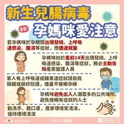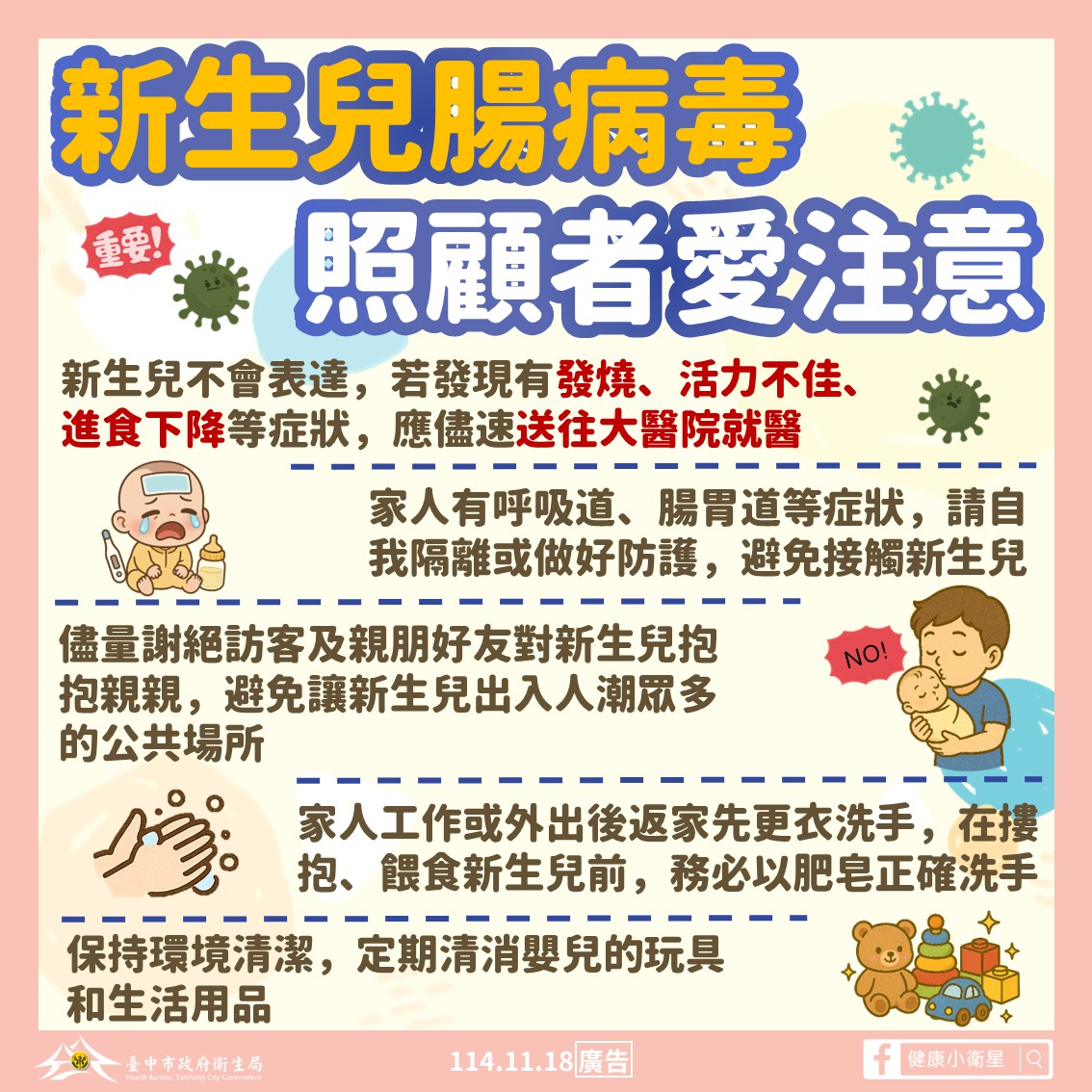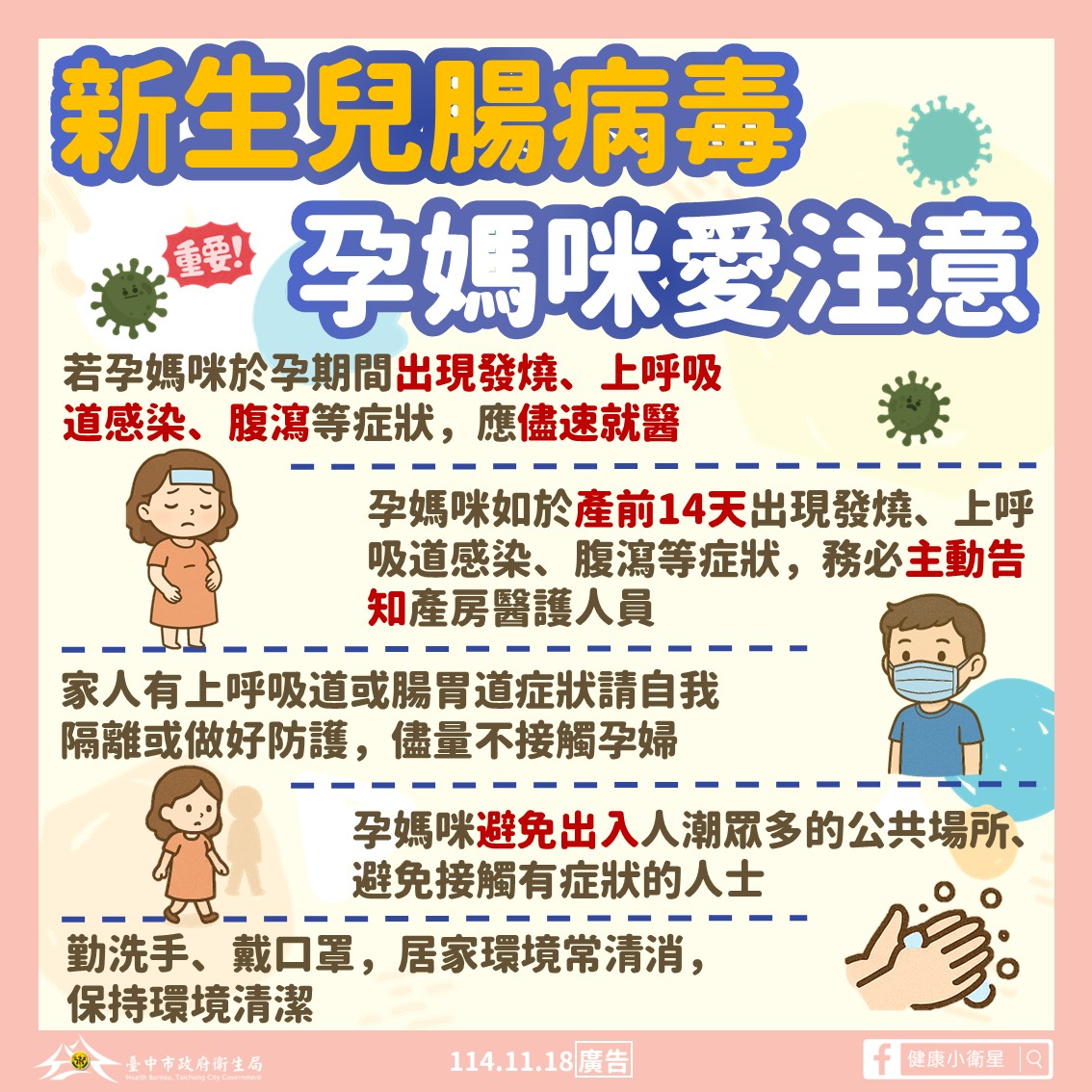 市府衛生局於11月11日接獲醫院通報龍井區1個月大女嬰疑似腸病毒感染併發重症死亡病例,經中央實驗室檢出感染伊科病毒11型,並於昨(17)日經疾管署研判確診,疫調發現,個案為本國籍低體重早產兒,出生1個月後,11月9日陸續出現食慾及活動力不佳等狀況,就醫後收治加護病房,雖經醫療團隊全力救治,病情仍快速變化,不幸於隔日病逝。114年度全國累計19例腸病毒感染併發重症確定病例,台中市累計6例腸病毒感染併發重症確定病例,皆為伊科病毒11型,呼籲準媽媽應提高警覺,如有發燒、腹瀉等症狀應儘速就醫,生產前14天內若曾出現不適,務必主動告知產房醫護人員,並在日常生活中落實手部衛生與環境清潔消毒,以降低病毒傳播風險、守護新生兒健康。