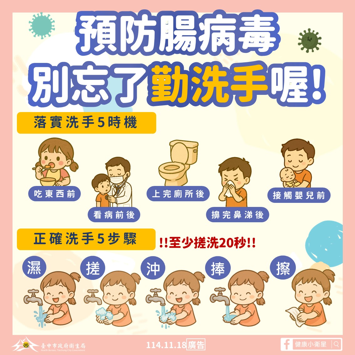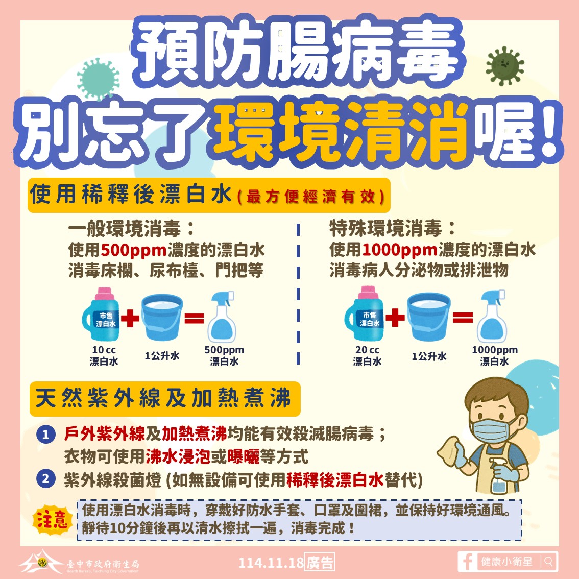 衛生局長曾梓展提醒,雖時序將進入冬季,但近期氣溫仍高,國內已進入腸病毒流行期,須注意社區腸病毒疫情風險,腸病毒傳染力強,大人、小孩都可能感染腸病毒,為避免腸病毒透過幼童頻繁互動傳播,而有疫情擴大或家庭群聚風險,呼籲民眾應落實「溼、搓、沖、捧、擦」洗手5步驟,以肥皂正確勤洗手,並注意洗手5時機,接觸到公共場所、交通工具後,請立即洗手,家長返家後亦請先洗手、沐浴及更換衣物後再接觸幼童;教托育機構與家長,定期以濃度500 ppm的含氯漂白水(10公升清水+100毫升市售家庭用漂白水)消毒幼童常接觸的物品表面,以降低腸病毒交叉感染的風險。