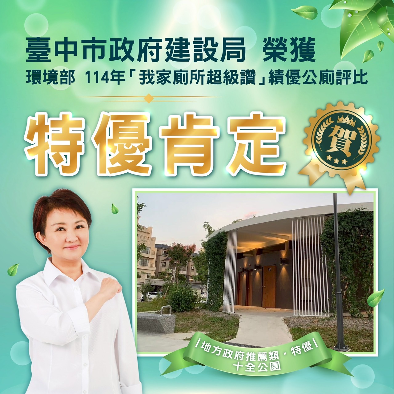 環境部舉辦「114年我家廁所超級讚–績優公廁評比活動」,台中市政府建設局以「十全公園」打造兼具美學、省電環保與多元族群友善設計的陽光公廁,從全國參賽案件中脫穎而出,榮獲地方政府推薦類「特優」肯定;頒獎典禮於昨(19)日舉行,建設局由副局長陳永欣代表局長陳大田出席受獎,展現台中市在公廁優化上的亮眼成果。