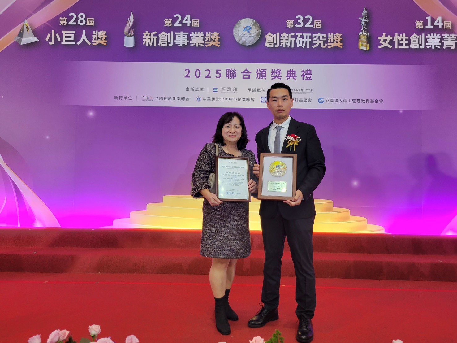 工策會總幹事黃于珊表示,全國級獎項競爭激烈,金手獎企業仍表現卓越,其中塑懋機械總經理蔡倍仁、副總經理余垂恒同時斬獲第28屆小巨人獎及第32屆創新研究獎,世曄實業榮獲第28屆小巨人獎,崇銘紡織榮獲第32屆創新研究獎,展現製造業在研發創新、產品差異化及永續經營的領航地位;而在女性創業領域,鴻鼎菓子總經理陳憶虹則以品牌策略、營運管理及市場擴張的卓越貢獻,榮獲第14屆女性創業菁英獎。