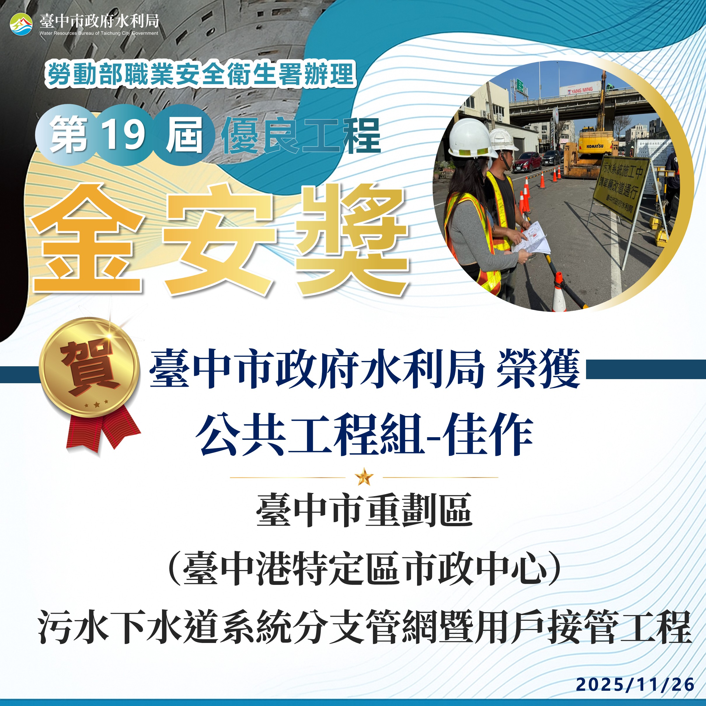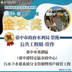 2025年「第19屆優良工程金安獎」頒獎典禮昨(26)日隆重舉行,台中市政府水利局以「台中市重劃區(台中港特定區市鎮中心)污水下水道系統分支管網暨用戶接管工程」,榮獲「推動職業安全衛生優良工程金安獎」公共工程類佳作肯定,展現水利局長期深耕工程職業安全衛生的成果。