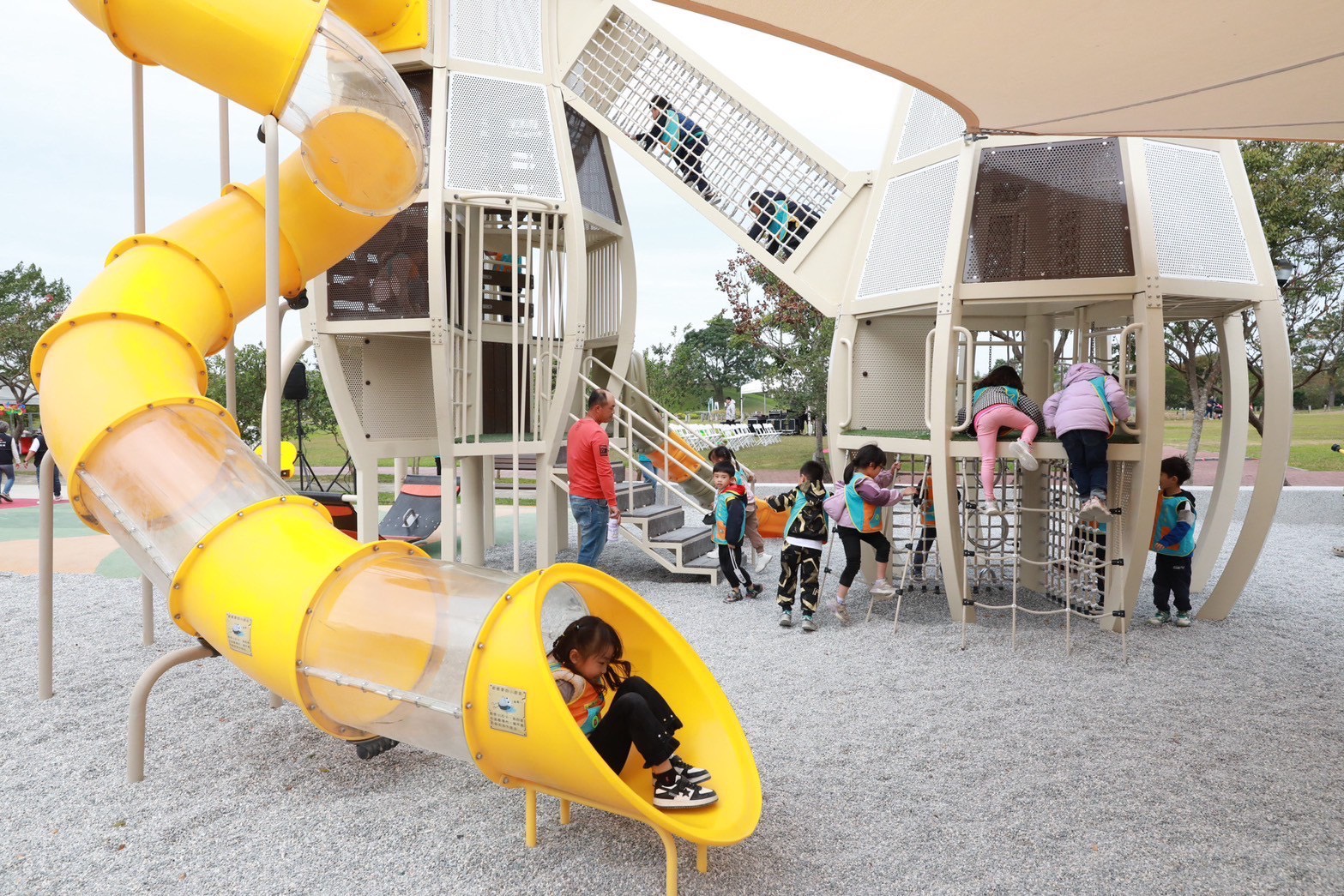 此外,市府也考量氣候變遷影響,推動「台中美樂地計畫3.0」,依照日照角度精心規劃遮陽設施,讓遊戲場在不同時段都能提供舒適環境,讓家長與孩童都能安心、愉快地享受公園時光。