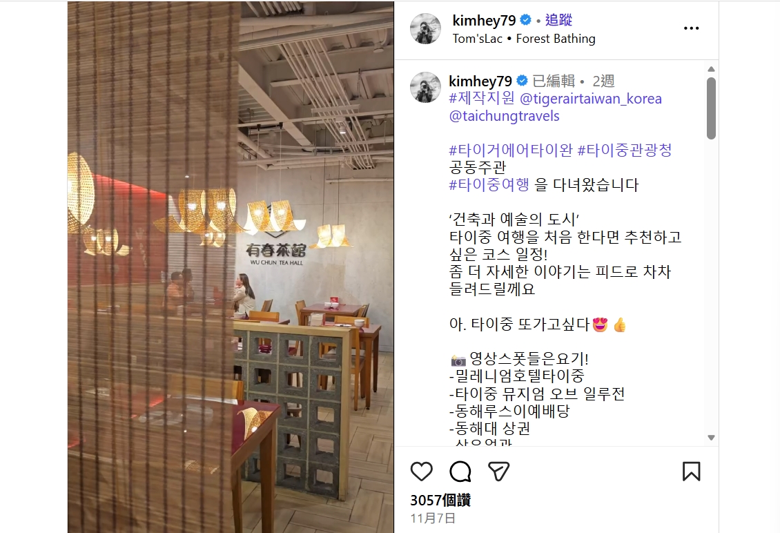 台中市政府觀光旅遊局與台灣虎航合作,今年8月至11月期間,邀請7位韓國人氣網紅體驗台中深度旅遊,透過社群貼文、影片及動態分享,成功提升台中在韓國市場的曝光度,打造在韓國年輕世代旅客心中「旅遊首選」的形象。