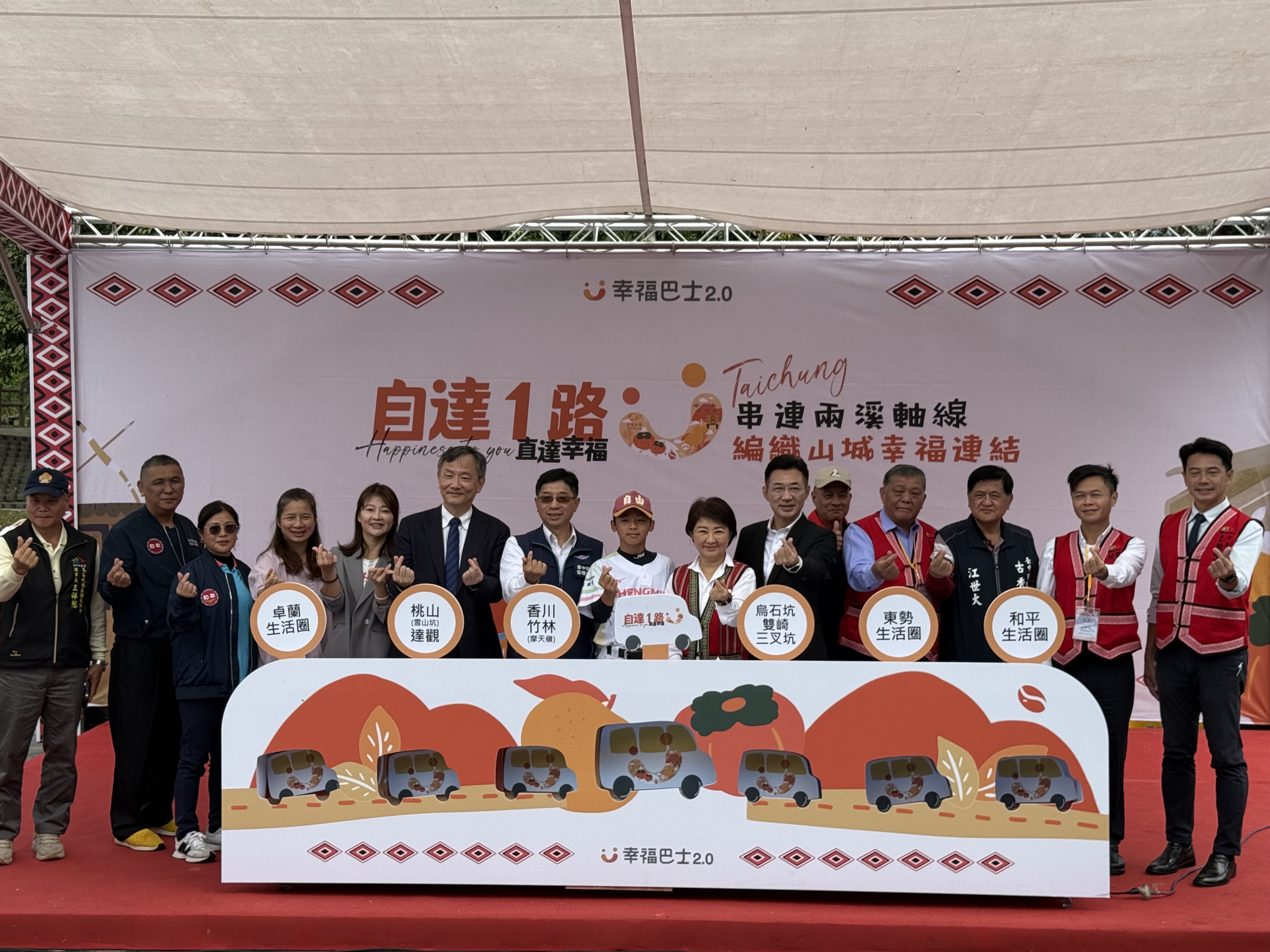 盧市長今日前往雙崎921紀念公園視察台中市第二條幸福巴士「自達幸福巴士」,此路線服務達觀、自由等里,試營運7個月即行駛1,154班、服務2,114人次,深受地方肯定。路線串聯大安溪與大甲溪交通軸線,提供桃山、達觀、竹林、香川、雙崎等部落至和平區行政中心,便利民眾就醫、就學與採買;加上中華汽車捐贈新車,擴大服務能量,以及在地社區參與營運,落實「在地人服務在地人」理念。
