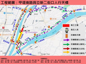 陳局長進一步說明,天橋自113年11月起試行封閉一年,以觀察交通量能與周邊動線調整情形,封閉期間未接獲任何反對意見,顯示地方支持度高,也證實封閉並未造成交通衝擊。此次鋼橋吊除將於29至30日假日辦理,以降低對學區與通勤族的影響,作業期間,甲堤南路「內新橋至立元一橋」將實施封閉管制,呼籲用路人提前改道並配合現場引導。待吊除完成後,市府將隨即推動甲堤南路與立新二街路口人行道及無障礙設施改善工程,預計於今年12月底前全數完成,提供市民更安全、友善的通行環境。
