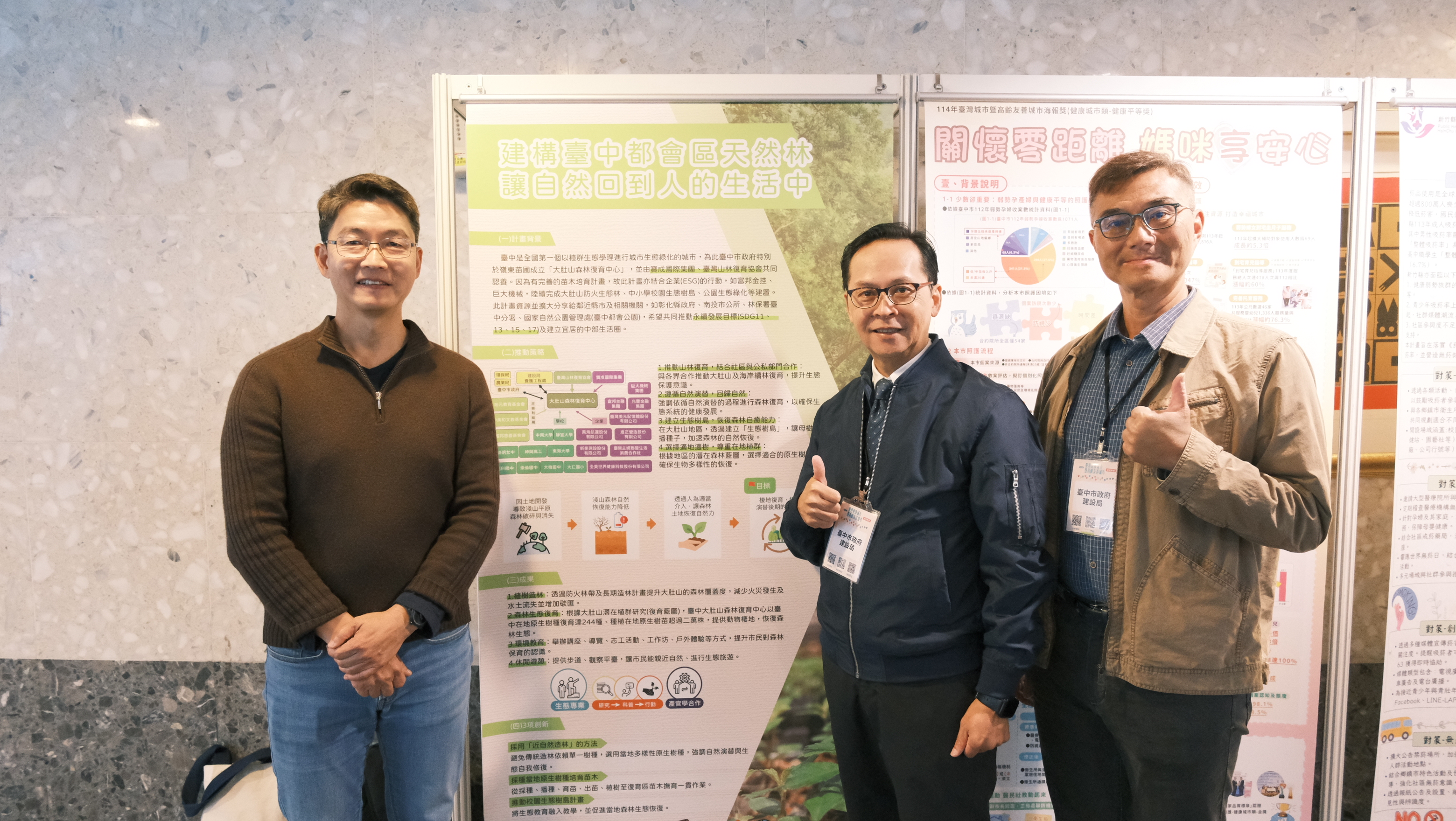 同時,建設局與台灣山林復育協會合作提報之「建構台中都會區天然林‧讓自然回到人的生活中」獲得「海報獎」佳作肯定;台灣山林復育協會自2016年成立起,以台中大肚山為起點,致力於原生植群復育、生物多樣性保育與生態教育。建設局透過與協會、企業共同推動「在地原生樹種育苗與種植」行動,於大肚山、龍目井步道等地建立原生植群復育示範區,透過尊重在地植群、建立生態樹島、恢復大肚山林自癒能力,累計植栽數百株原生種樹木,此獎項彰顯台中市在「都市天然林復育、自然回歸人日常」之永續路徑的創新實踐。