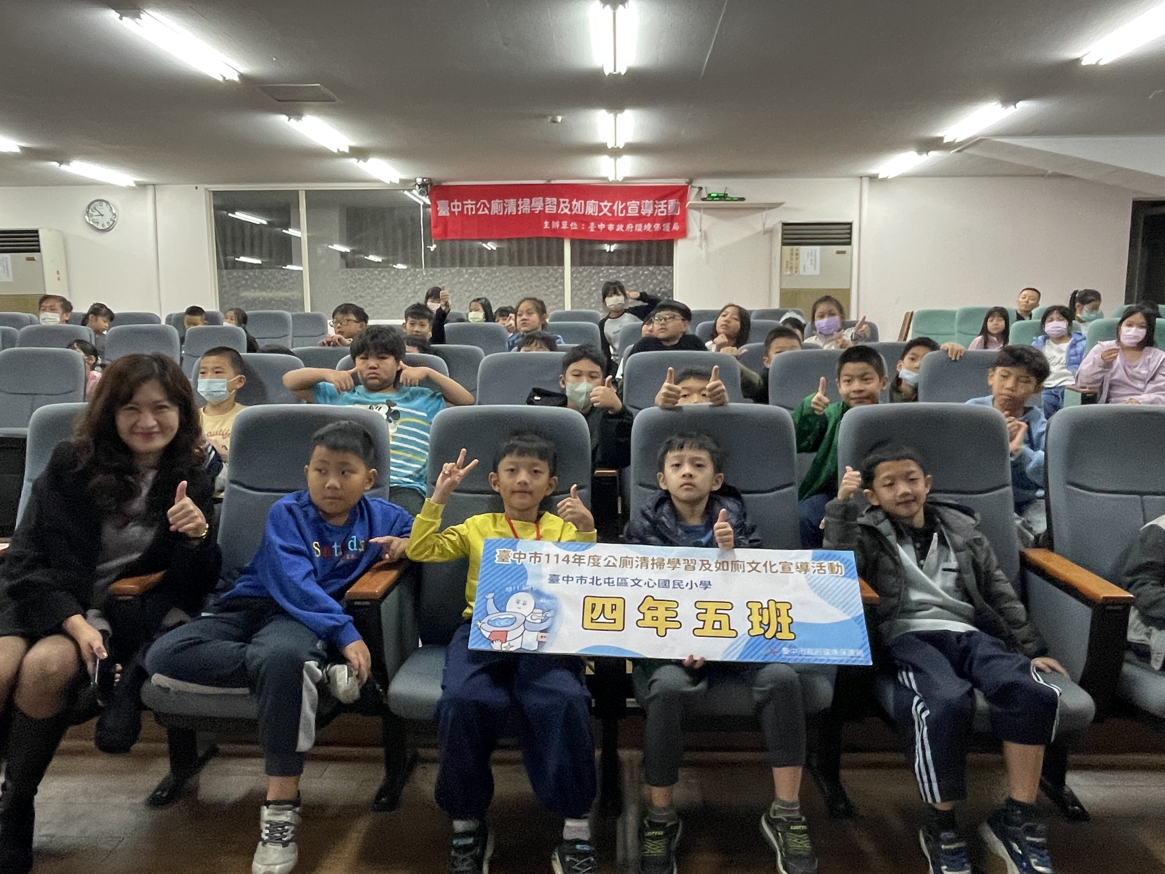 環保局說明,今年與北屯區文心國小攜手合作辦理如廁文化宣導活動,透過淺顯易懂的互動方式推廣5個「優質如廁行為」的行動與口訣(敲敲、關門、上、沖、洗),並讓學童認識不同類型廁所標示、辨識衛生紙丟馬桶標示及廁所整潔重要性。另播放煙蒂不落地的擬人化動畫宣導影片,引導孩子們體認到亂丟煙蒂對環境造成的危害,培養與會學童成為環保小尖兵。