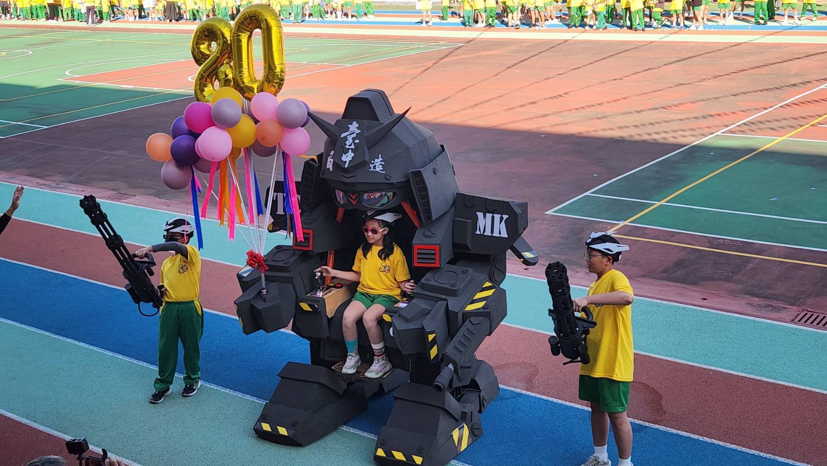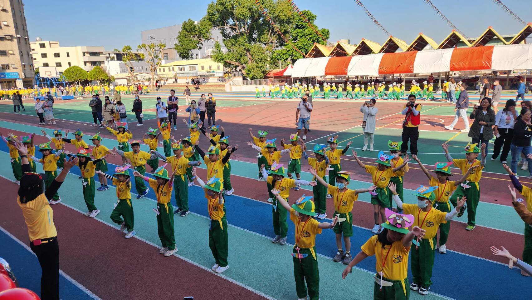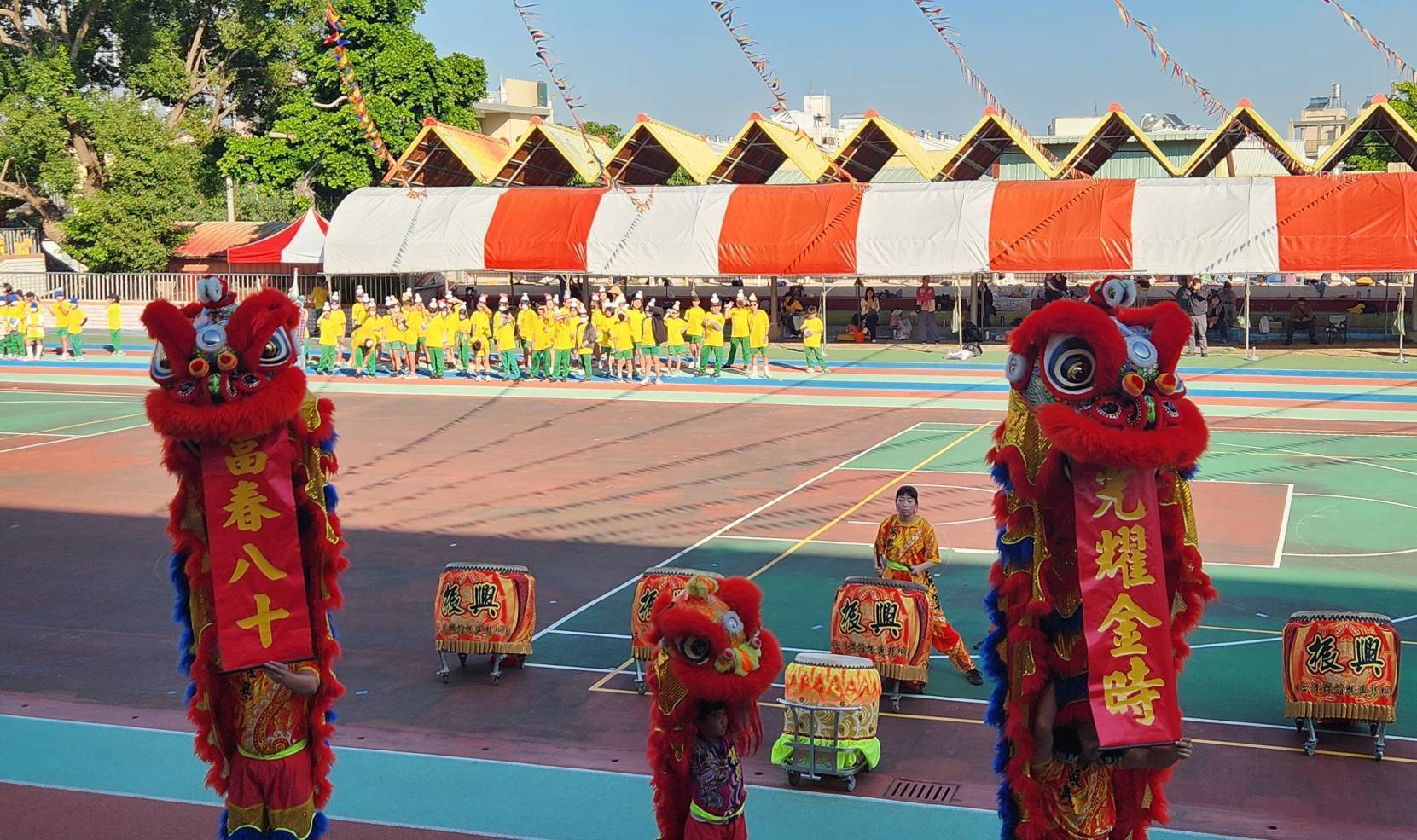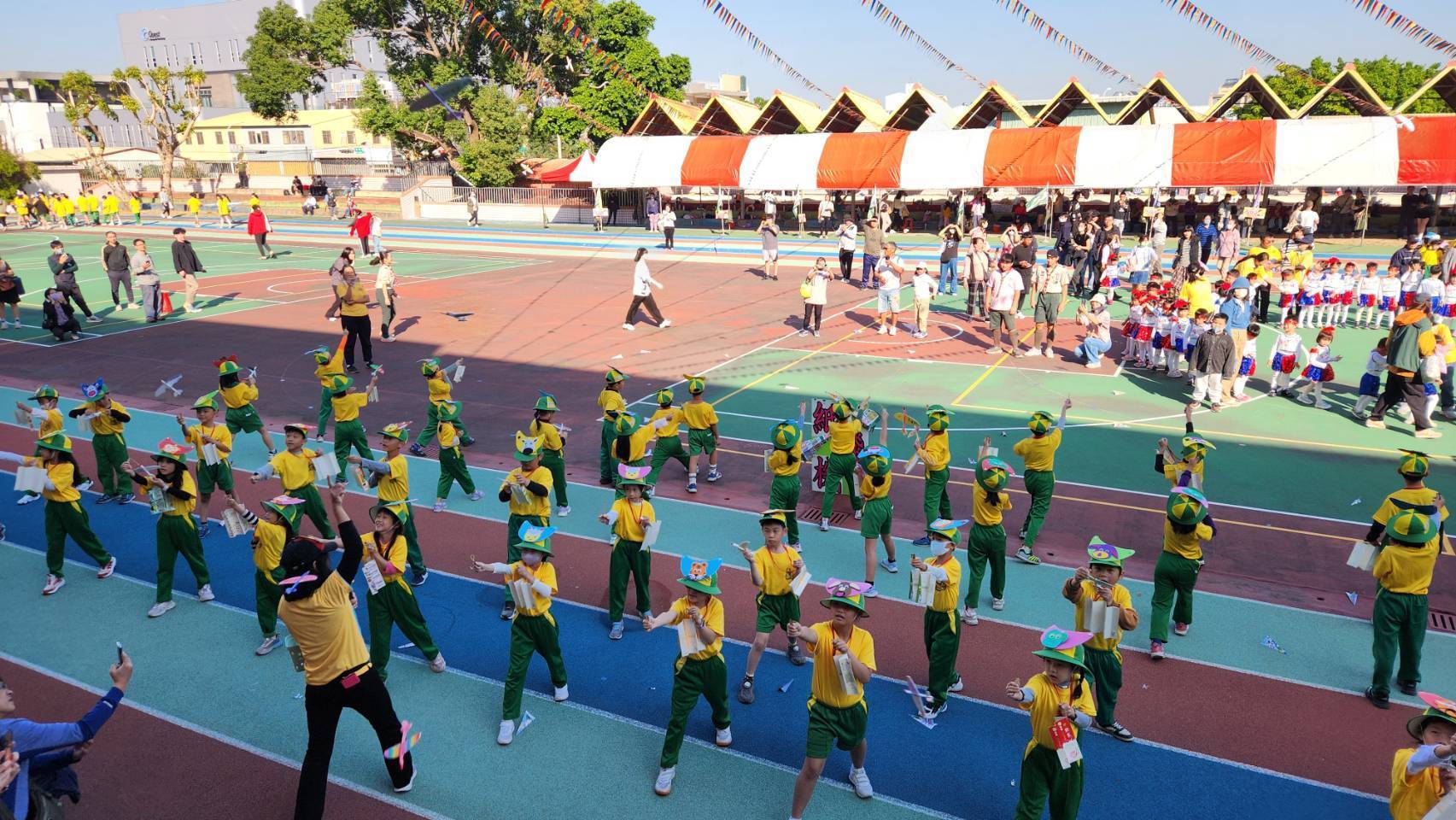 教育局指出,今日校慶活動由震撼的鼓陣與舞獅揭開序幕,鑼鼓喧天、氣勢磅礡,隨後由各年級學生列隊入場,步伐整齊、活力滿滿,展現富春孩子的自信與朝氣。最受矚目的「校訂飛行課程展演」更掀起全場高潮,一年級展現龍捲風旋舞的律動,二年級以創意紙飛機秀逗趣登場,高年級則帶來氣功飛機與電動自由飛,翱翔在空中的飛行作品象徵孩子的想像力、創造力與無窮可能,也形成富春校園獨特的教育風景線。