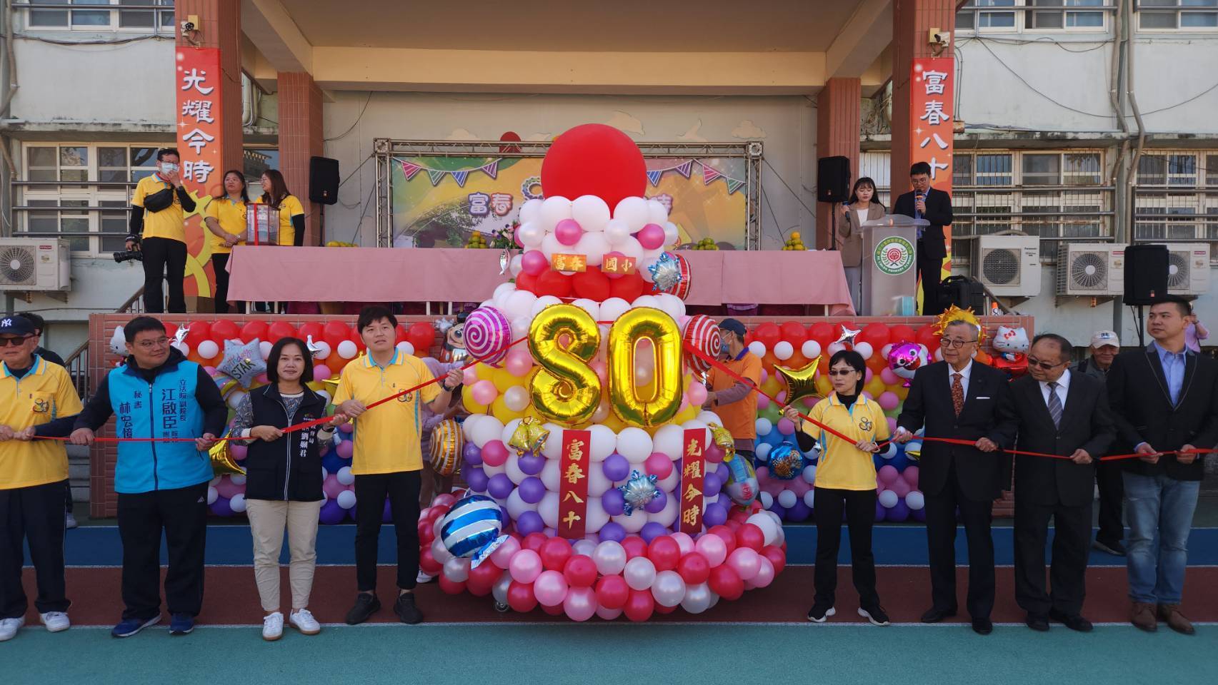 台中市豐原區富春國小今(29)日舉辦「富春八十,光耀今時」80週年校慶嘉年華,台中市政府教育局劉姵君專門委員代表市長盧秀燕出席祝賀,與歷屆教職員工、校友及家長社區共同慶賀學校八十華誕,場面熱鬧溫馨。