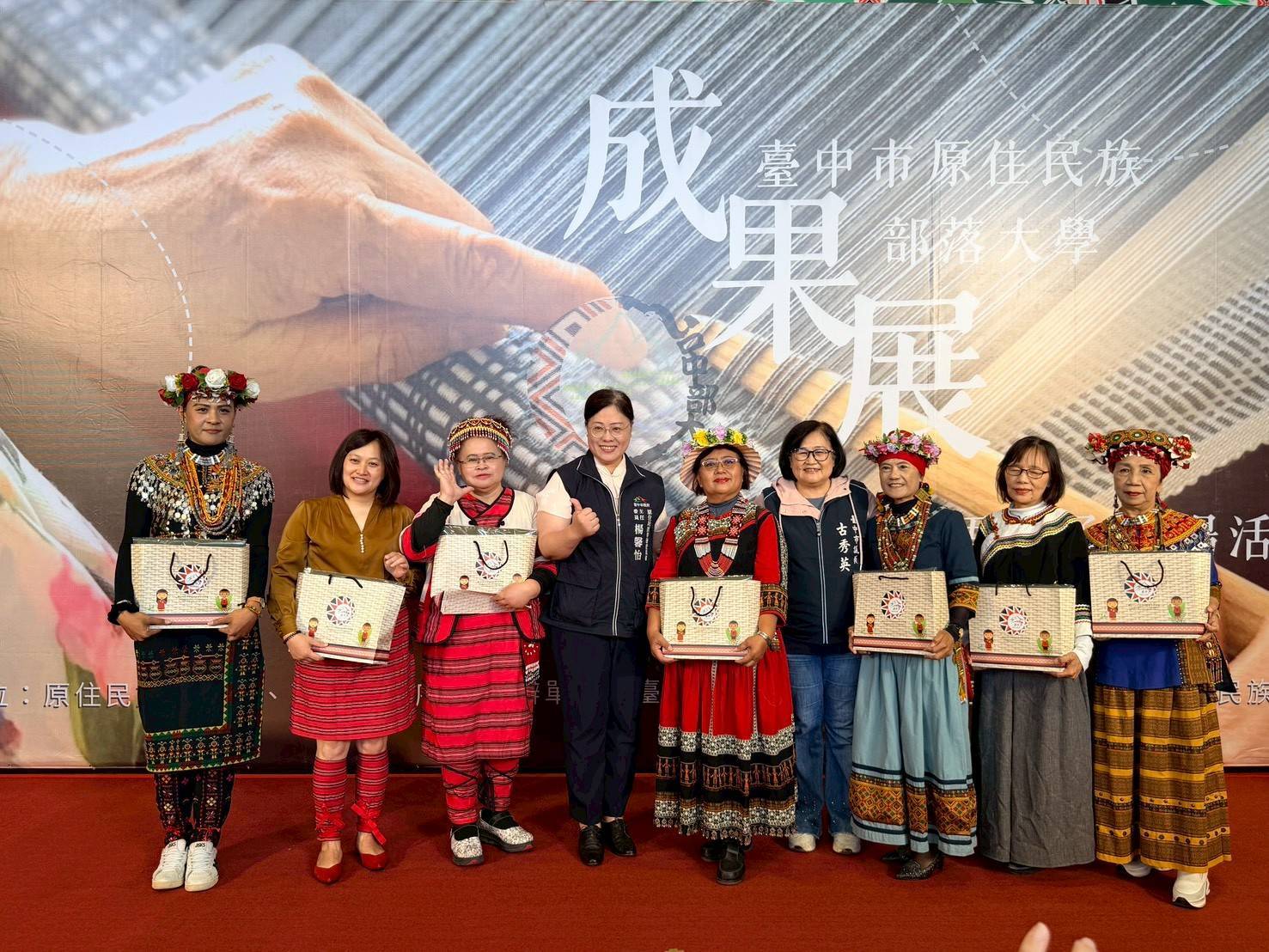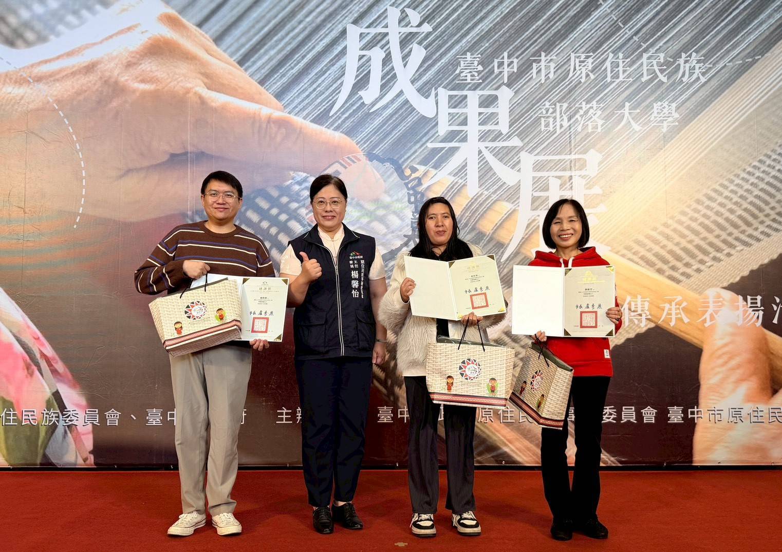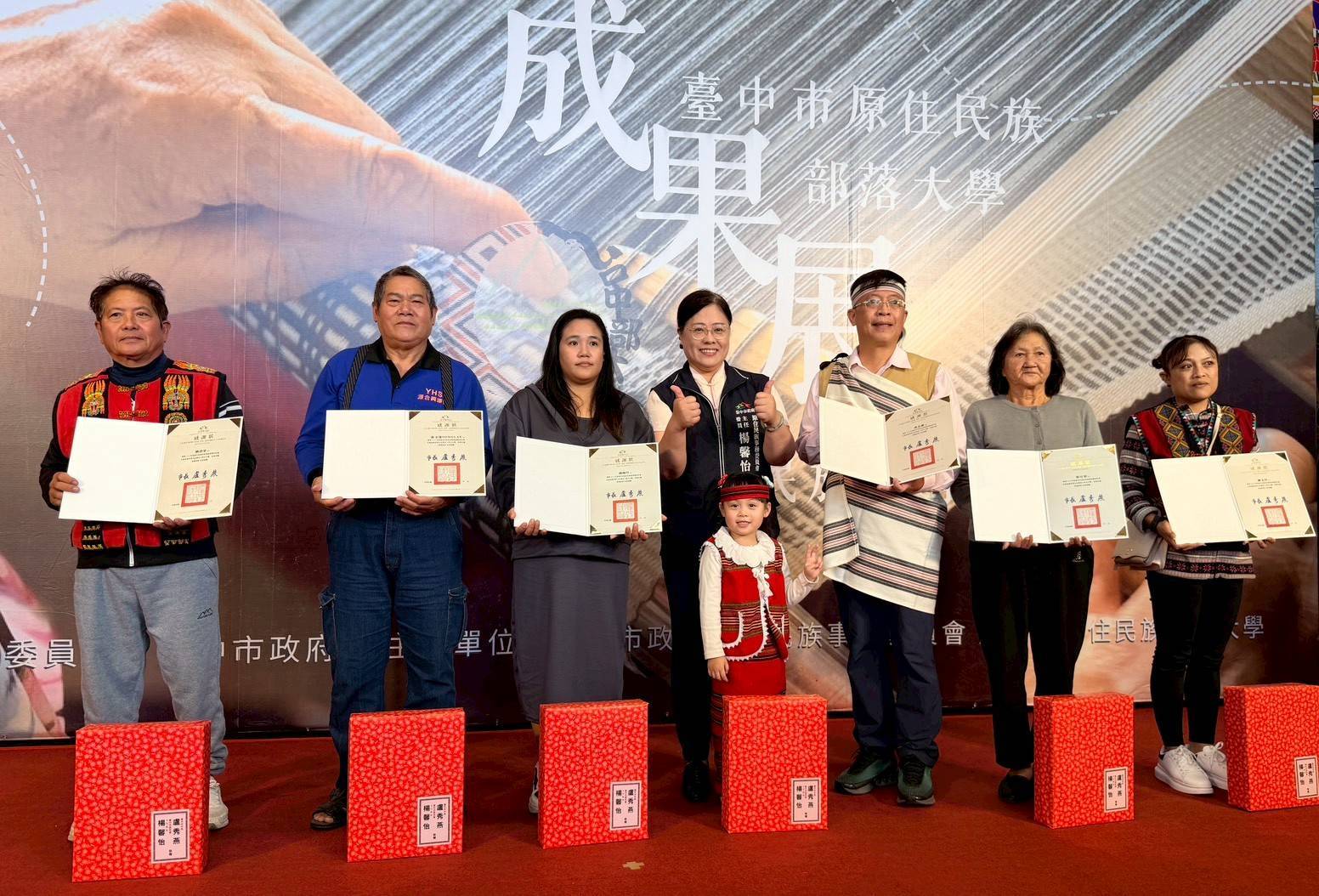 台中市政府原住民族事務委員會今(29)日在原民會一樓大廳舉辦「台中市原住民族部落大學成果展暨原住民族語傳承表揚活動」,由原民會主任委員楊馨怡代表市長盧秀燕出席,與近 200 位講師、學員、族語保母與志工齊聚,共同見證一年來在文化教育與語言復振上的豐碩成果。部落大學自 100 年成立以來,已成為台中推動原住民族文化教育的重要基地,課程累積逾一萬人次參與,並培育超過 250 位講師,是本市多元文化扎根最重要的力量之一。