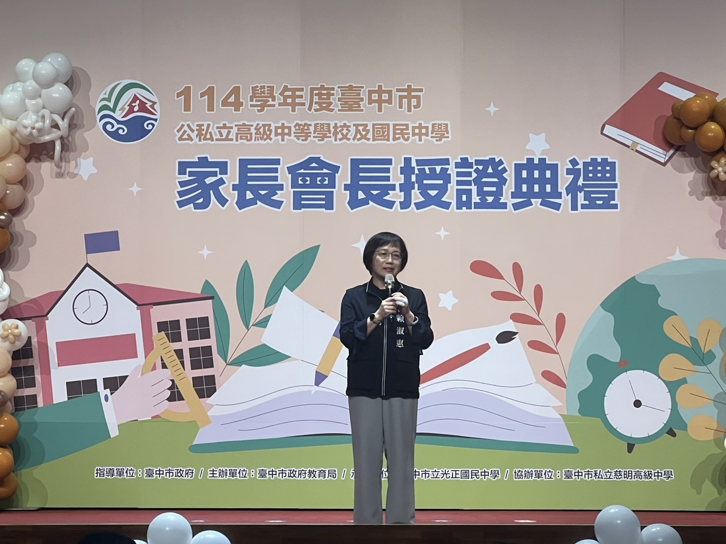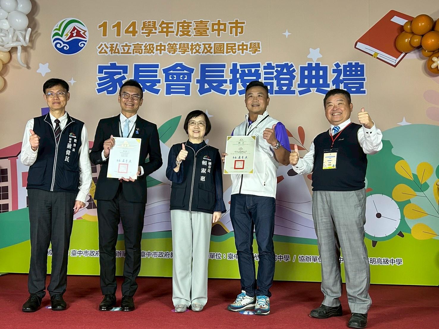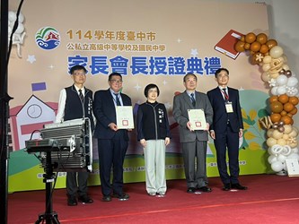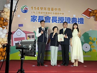 台中市政府教育局今(1)日在慈明高中舉辦「114學年度台中市公私立高級中學及國民中學家長會長授證典禮」,由副市長賴淑惠頒贈聘書與感謝狀給台中市123所高、國中新(連)任及卸任家長會長,感謝所有家長會長以愛心與行動支援教育,成為學校與家庭間最重要的橋樑,也期勉大家持續攜手合作,共創優質的教育環境。