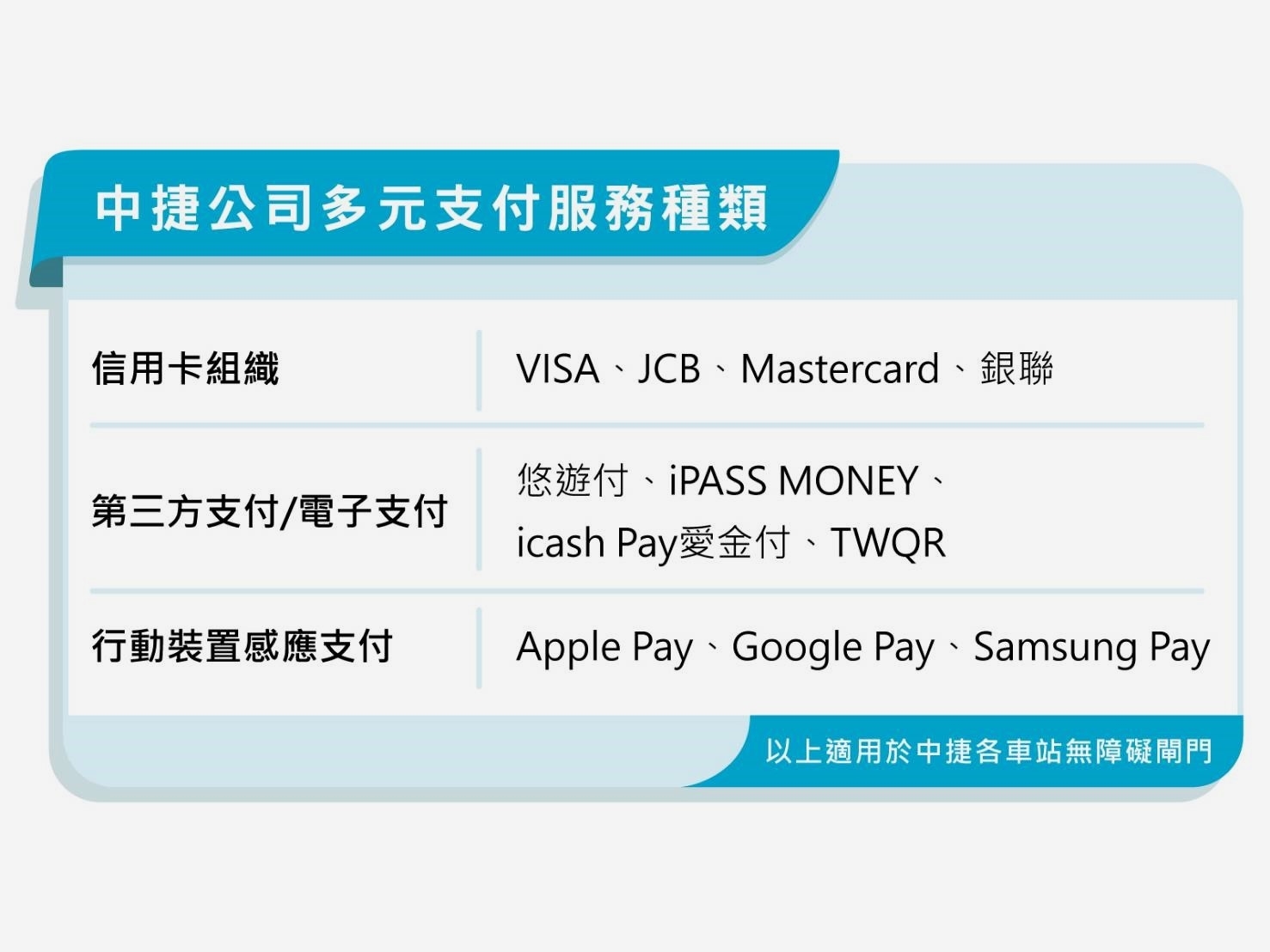 目前台中捷運綠線已提供多元支付工具,在上述系統轉換期間,旅客仍可使用既有電子票證及其他行動支付方式,其中包括悠遊付、iPASS MONEY、icash Pay愛金付及TWQR均可掃碼搭車,同樣享有快速、便利的服務。中捷公司後續也將導入更多元且優化的支付選擇,最新資訊將公告於官方網站及社群平台,敬請旅客留意。